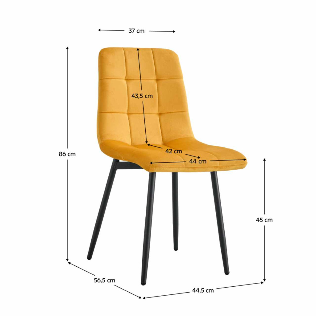 Anyag: Velvet szövet/fémA szövet kopásállósága a Martindale teszt szerint: 80 000 ciklusSzín: sárga/feketeMéretek (SzxMéxMa): 44,5x56,5x86 cmÜlés magassága: 45 cmÜlés mélysége: 42 cmÜlés szélessége: 44 cmHáttámla magassága: 43,5 cmHáttámla szélessége: 37 cmTeherbírás: 110 kgStílusosDekoratív steppelésSzétszerelve szállítva