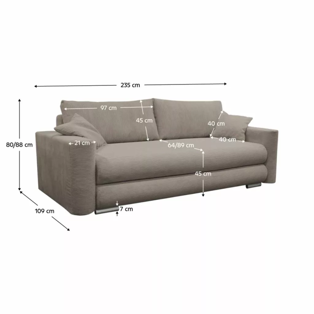 Anyag: szövet Poso 03A szövet kopásállósága a Martindale teszt szerint: 90.000 ciklusSzín: szürkésbarna TaupeMéretek (SzxMéxMa): 235x109x80/88 cmÜlés magassága: 45 cmÜlés mélysége: 64/89 cmAlvófelület (SzxHo): 155x192 cmAz alsó tér magassága a padlótól: 7 cmKartámasz magassága: 62 cmNagy párnák mérete (SzxMa): 97x45 cmKis párnák mérete (SzxMa): 40x40 cmMűanyag lábakLábak színe: ezüstTöltet: Falista rugó/pur habTeherbírás/személy: 90 kgTeljesen kárpitozottSzéthúzhatóTárhellyelPárnákkalPraktikusModernMegrendelésreA szállítási idő 6-8 hétSzétszerelve szállítvaMegrendelhető a Poso szövet 10 színváltozatában, ár: 392 500 Ft. Egyedi megrendelés esetén a megadott összeg 20%-át előlegként szükséges befizetni. Az előleg befizetése után a kérése gyártásba kerül. A szállítási idő 6-8 hét.