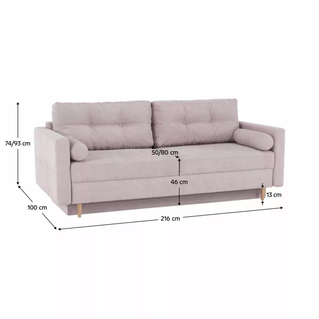 Anyag: szövet Queens 19A szövet kopásállósága: 30 000 MartindaleSzín: öreg rózsaszínMéretek(SzéxMéxMa): 216x100x93 cmKinyithatóAlvóhely mérete (SzéxHo): 190x155 cmÜlésmagasság: 46cmÜlésmélység párnákkal: 50cmÜlésmélység párnák nélkül: 80 cmAz alsó tér magassága a padlótól: 13 cmA merev rész magassága hátul: 74 cmTerhelhetőség ágyanként: 90 kgEgész felületén kárpitozottBonellrugós ülésSkandináv stílusTárolásKét háttámla párnaKét dekoratív hengeres párnaMindennapi alvásra alkalmasSzétszerelt állapotban szállítva