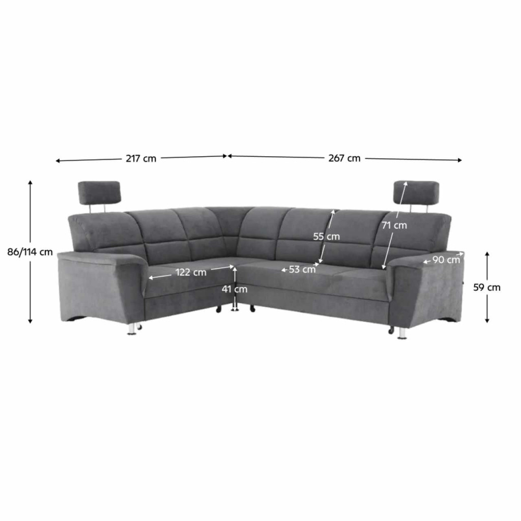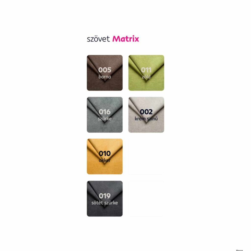 Anyag: szövetA szövet kopásállósága: 72 000 MartindaleSzíne: Matrix 17 szürkeMéretek (SzéxMéxMa): 267x217x86/114 cmKartámasz méretei (MéxMa): 90x59 cmFekvőterület (SzéxH): 118x200 cmÜlőrész magassága: 41 cmÜlőrész mélysége: 53 cmTeherbírás: 90 kgHáttámla magassága: 55 cmSarokKárpitozottKinyithatóRakodótérrelBetét: falista rugó/pur habManual kinyitható rendszerÁllítható fejtámlákkalFém lábakkal krómozott felületi kezelésselBalos változatSzétszerelt állapotban szállítjukRendelhető 6 színváltozatban Matrix szövetből. Ár fotel: 194 900 Ft, puff: 64 900 Ft, sarok: 648 500 Ft. Egyedi megrendelés esetén szükség van az adott összegnek a 20%-át befizetni,mint előleg. Az előleg befizetése után az Ön követelményét benyújtjuk a gyártónak. Szállítási idő 6-8 hét.