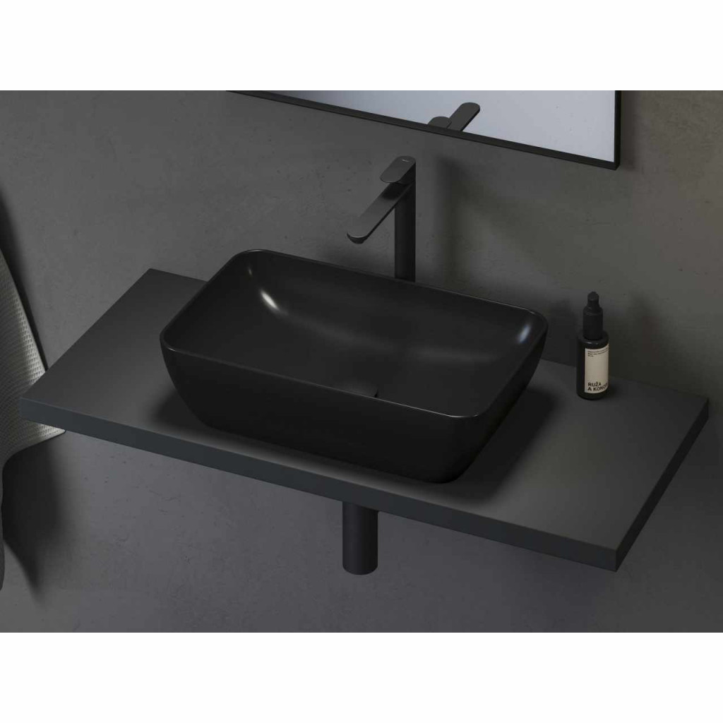 Vékonyfalú kerámia mosdó Uni Slim, asztalra vagy szekrényre szerelhető, túlfolyó nélkül. Fekete fényes kivitelben.