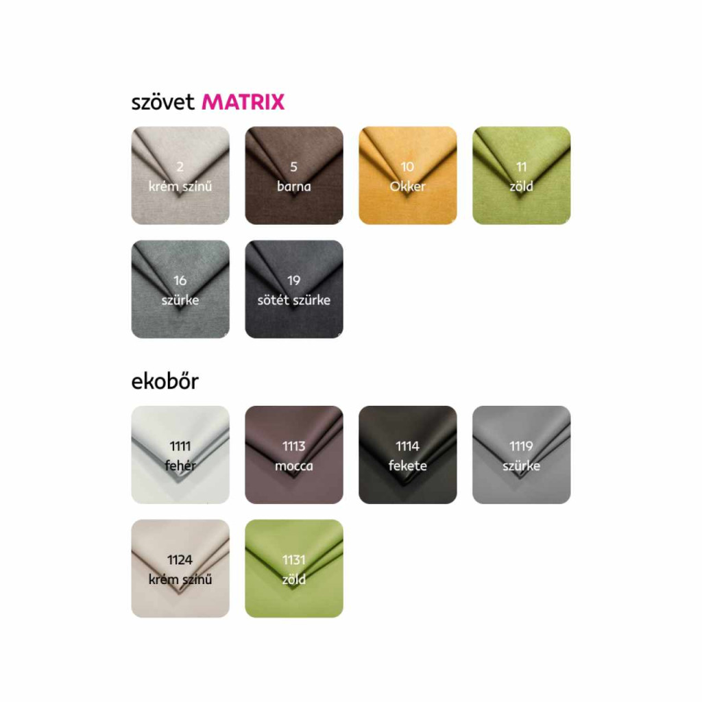 Anyag: műbőr/szövetA szövet Matrix kopásállósága: 72 000 MartindaleA textilbőr kopásállósága: 100 000 MartindaleSzíne: fekete/ Matrix 19 sötétszürkeMéretek (SzéxMéxMa): 325x168/217x86/106 cmFekvőterület (SzéxH): 116x260 cmÜlőrész magassága: 41 cmÜlőrész mélysége: 53 cmTeherbírás: 90 kgHáttámla magassága: 55 cmU alakbanKárpitozottKinyithatóRakodótérrelBetét: falista rugó/pur habManual kinyitható rendszerÁllítható fejtámlákkalFém lábakkal krómozott felületi kezelésselBalos változatTeherbírás: 90 kgSzállítás szétszerelveRendelhető 6 színváltozatban Matrix szövetből. Ár fotel: 194 900 Ft, puff: 64 900 Ft, sarok: 721 900 Ft. Egyedi megrendelés esetén szükség van az adott összegnek a 20%-át befizetni,mint előleg. Az előleg befizetése után az Ön követelményét benyújtjuk a gyártónak. Szállítási idő 6-8 hét.