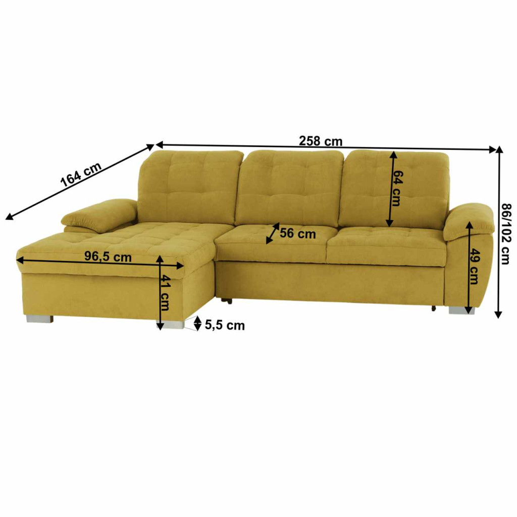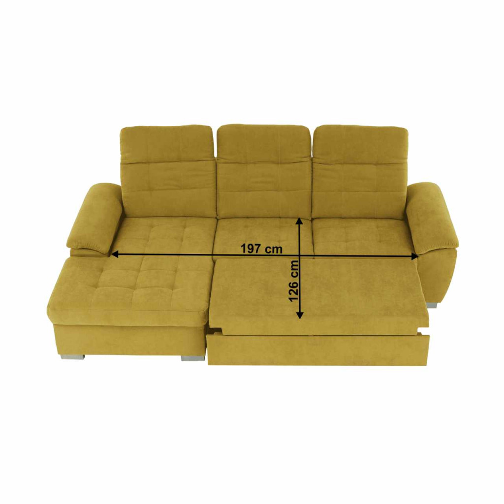 Sarok ülőgarnitúra, teljesen kárpitozott, kinyitható, ágyneműtartóval EVANGELIN Anyag: SORO 40 szövet A szövet kopásállósága: 90 000 - 100 000 Martindale Szín: mustár színű Méretek (SzéxMéxMa): 258x164x102/86 cm Fekvőfelület mérete (SzéxHo): 197x126 cm Az alsó tér magassága a padlótól: 5,5 cm Ülésmagasság: 41 cm Ülésmélység: 56 cm Terhelhetőség ágyanként: 90 kgBalos kivitel Állítható fejtámlák 6 fokozatban állítható fejtámaszDíszpárnák