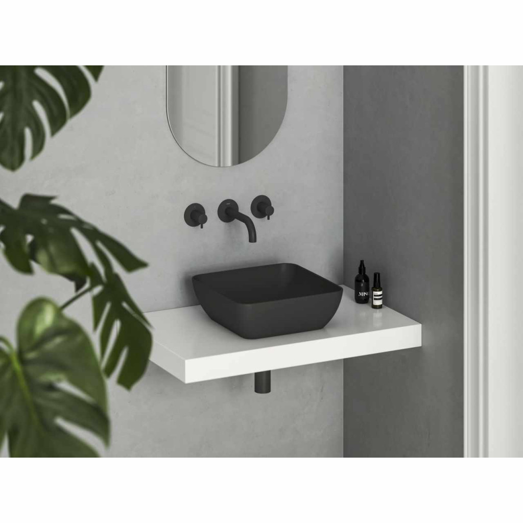 Vékonyfalú kerámia mosdó Uni Slim, asztalra vagy szekrényre szerelhető, túlfolyó nélkül. Matt fekete kivitelben.