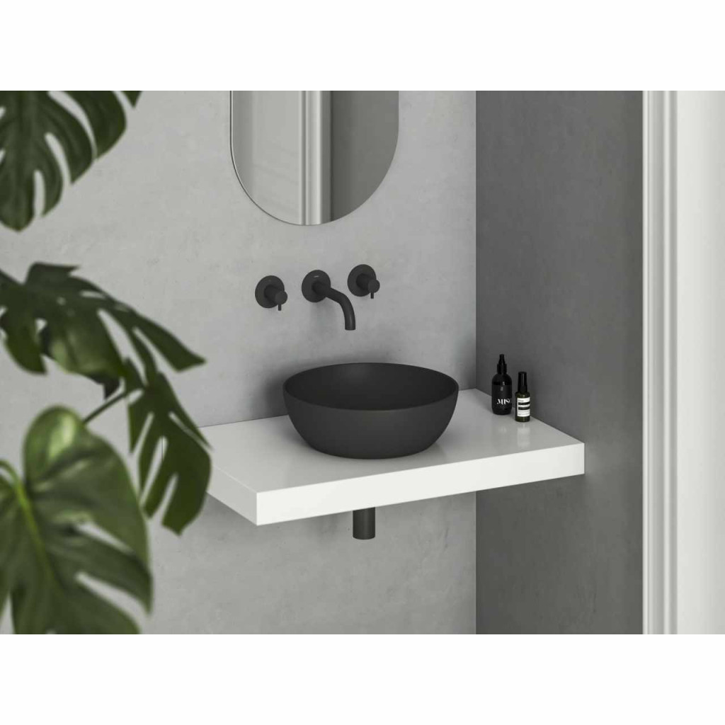 Kerámia Uni Slim mosdó, mely asztalra vagy szekrényre szerelhető, túlfolyó nélkül. Matt fekete színben.