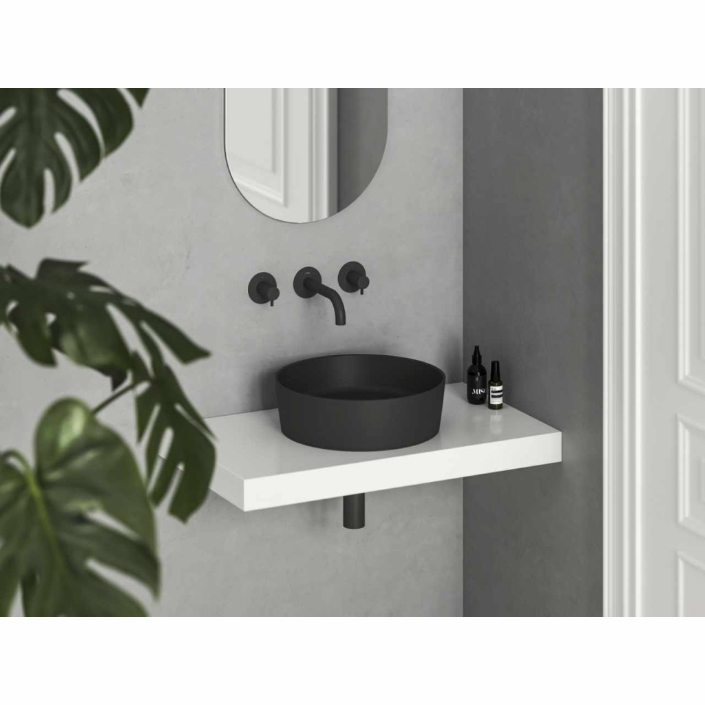 Kerámia Uni Slim mosdó, mely asztalra vagy szekrényre szerelhető, túlfolyó nélkül. Matt fekete színben.