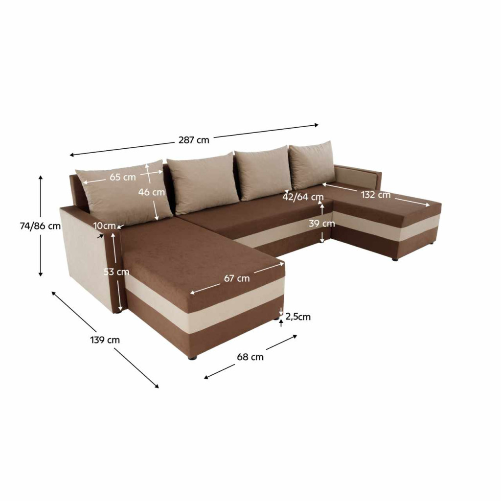 Kárpit anyaga: szövet Alova 67/07A szövet kopásállósága a Martindale teszt szerint: 85 000 ciklusKárpit színe: barna/bézsMéretek (SzxMéxMa): 287x139/139x74/86 cmAlvófelület (SzxHo): 115x265 cmÜlés magassága: 39 cmÜlés szélessége: 42/64 cmPárnákkal szállítvaPárna méretei (SzéxMa): 65x46 cmOttomán szélessége: 67 cmKartámasz (SzéxMa): 10x54 cmAz alsó tér magassága a padlótól: 2,5 cmTöltet: Pur hab T28U alakKihúzhatóSarokUniverzális (B/J)TárhellyelSzétszerelve szállítva