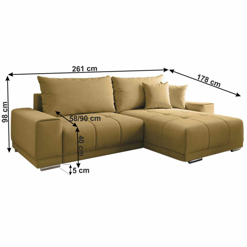 Anyag: szövet SOROA szövet kopásállósága: 90 000 - 100 000 Martindale Kivitelezés: 40 mustár színűMéretek (SzxMéxMa): 261x178x98 cmAlvófelület (SzxHo): 148x203 cmÜlés magassága: 40 cmÜlés mélysége: 58/90 cmAz alsó tér magassága a padlótól: 5 cmTeljesen kárpitozottUniverzális (B/J)SarokKinyitható TárhellyelDekoratív steppelésPárnákkalRugós falista/PUR-habSzétszerelve szállítjuk.