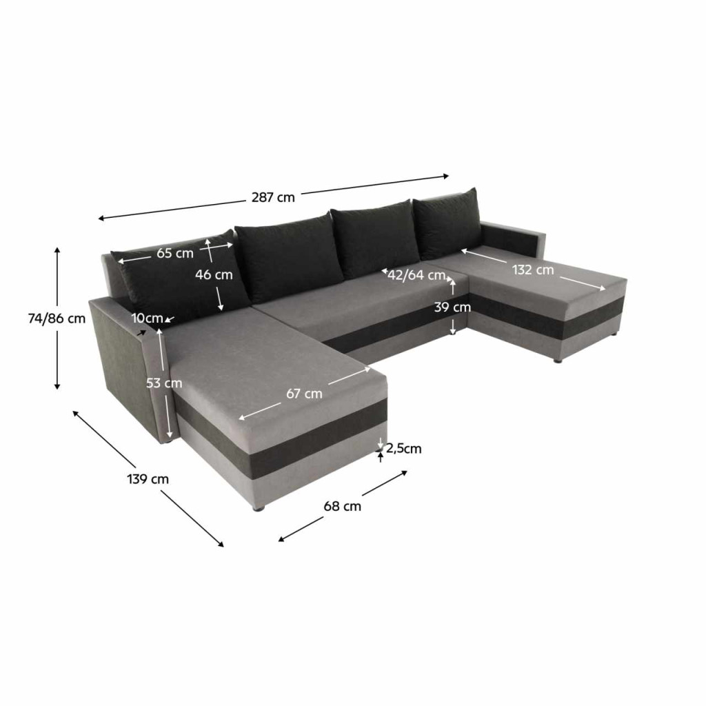 Kárpit anyaga: szövet Alova 36/04A szövet kopásállósága a Martindale teszt szerint: 85 000 ciklusKárpit színe: szürke/feketeMéretek (SzxMéxMa): 287x139/139x74/86 cmAlvófelület (SzxHo): 115x265 cmÜlés magassága: 39 cmÜlés szélessége: 42/64 cmPárnákkal szállítvaPárna méretei (SzéxMa): 65x46 cmOttomán szélessége: 67 cmKartámasz (SzéxMa): 10x54 cmAz alsó tér magassága a padlótól: 2,5 cmTöltet: Pur hab T28U alakKihúzhatóSarokUniverzális (B/J)TárhellyelSzétszerelve szállítva