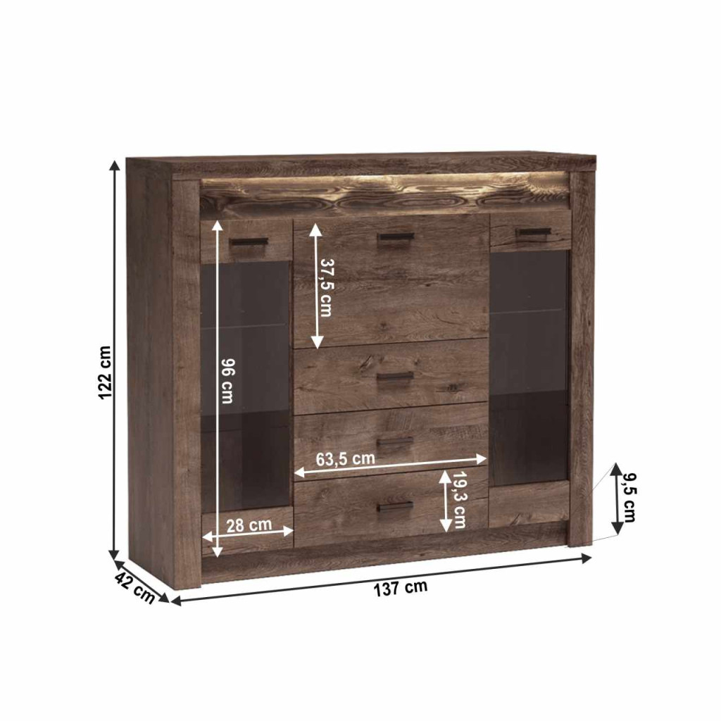 Komód INFINITY 06 Váz: 48 mm vastag Fém fogantyúk Anyag: laminált DTD, ABS élek Színváltozat: sötét kőris Méretek (SzéxMéxMa): 137x42x122 cm Szállítás szétszerelve. Szállítás LED világítás nélkül, LED világítás rendelhető hozzá.