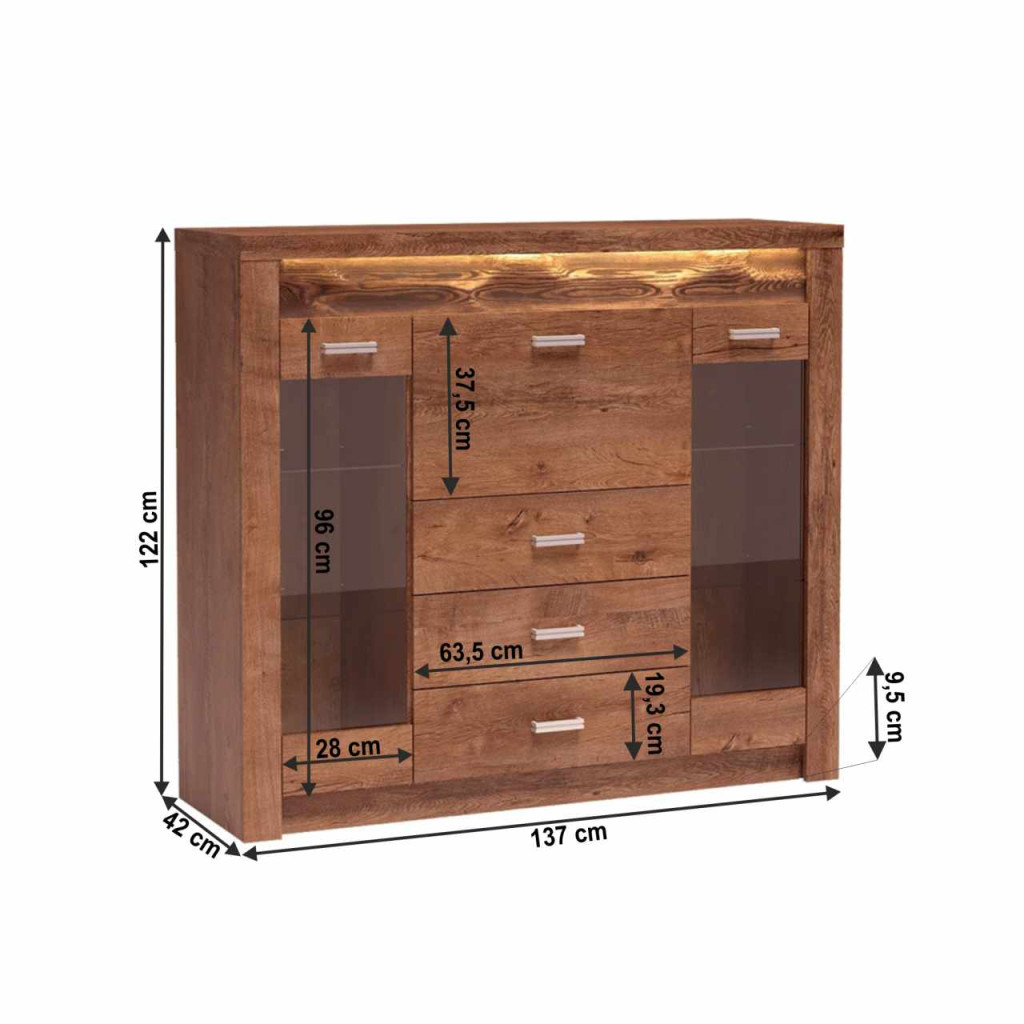 Vitrines komód Inifinity 08 Váz vastagsága: 48 mm, fém fogantyúk Anyag: laminált DTD, ABS élek Színváltozat: világos kőris Méretek (SzéxMéxMa): 137x42x122 cm Megvilágított léc masszív fából Szállítás LED világítás nélkül LED világítás hozzárendelhető Szétszerelt állapotban szállítjuk