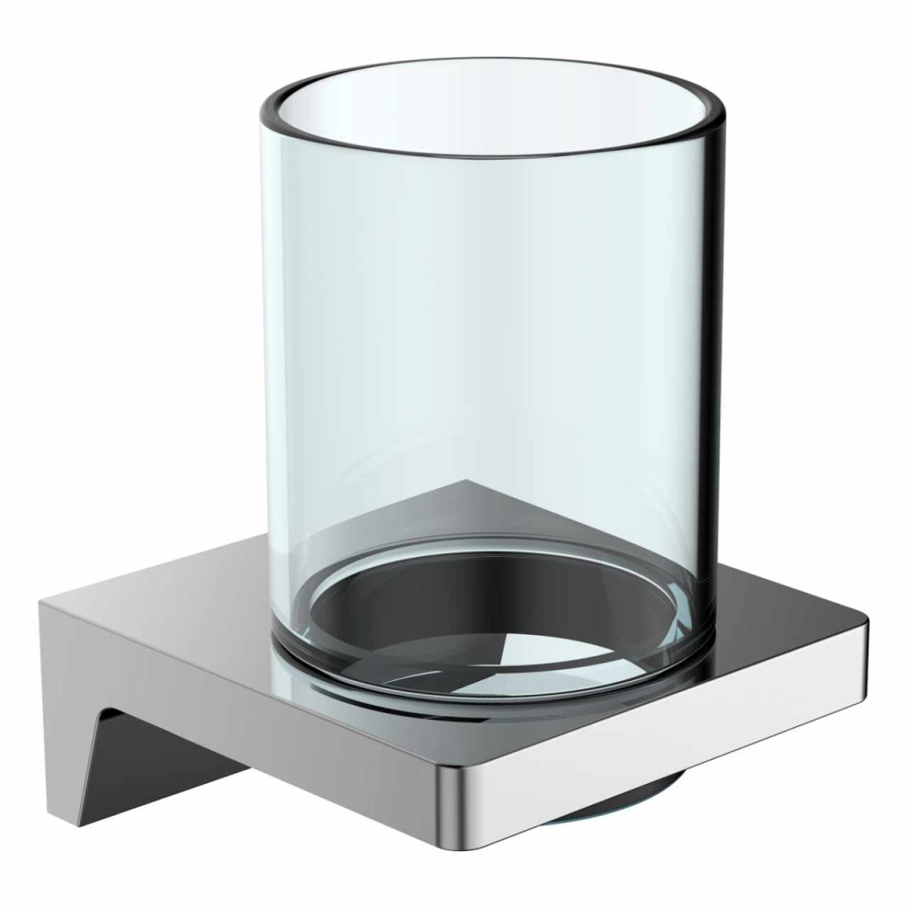 Krómozott, fém, fürdőszobai fali pohártartó, üvegpohárral.