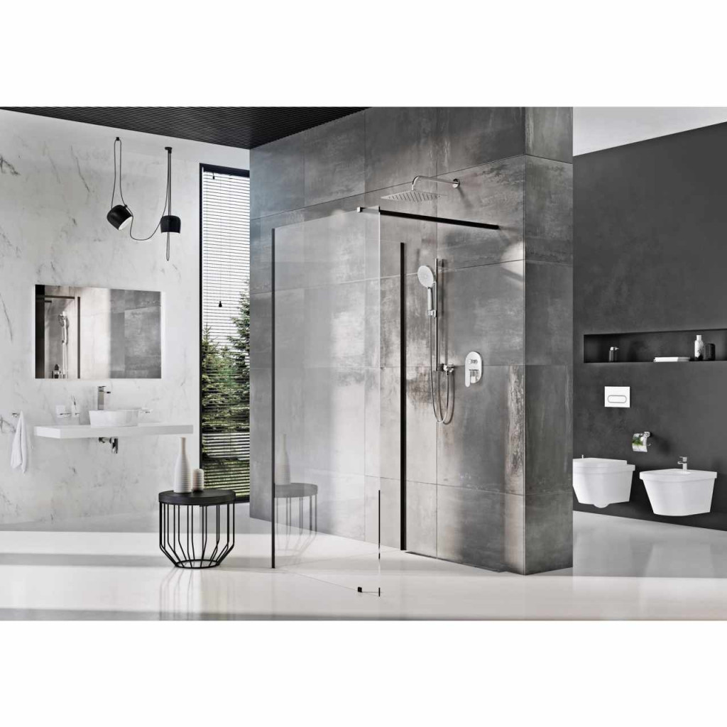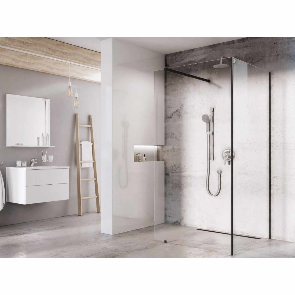 A Walk-In Corner zuhanykabin fekete felületkezelésű a fém alkatrészeknél. Ajánljuk, hogy közvetlenül a padlóra telepítse, beépített zuhanyfolyókával vagy padlóösszefolyóval. A zuhanykabin univerzális, a telepítés során választhatja meg a jobb vagy bal oldali bejáratot. A csomag két fix üvegfalat tartalmaz, rögzítő profillal és sarokcsatlakozó profillal fekete kivitelben.