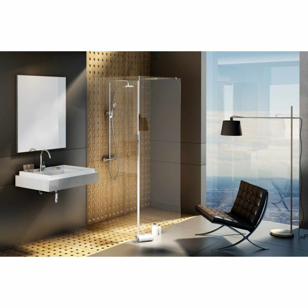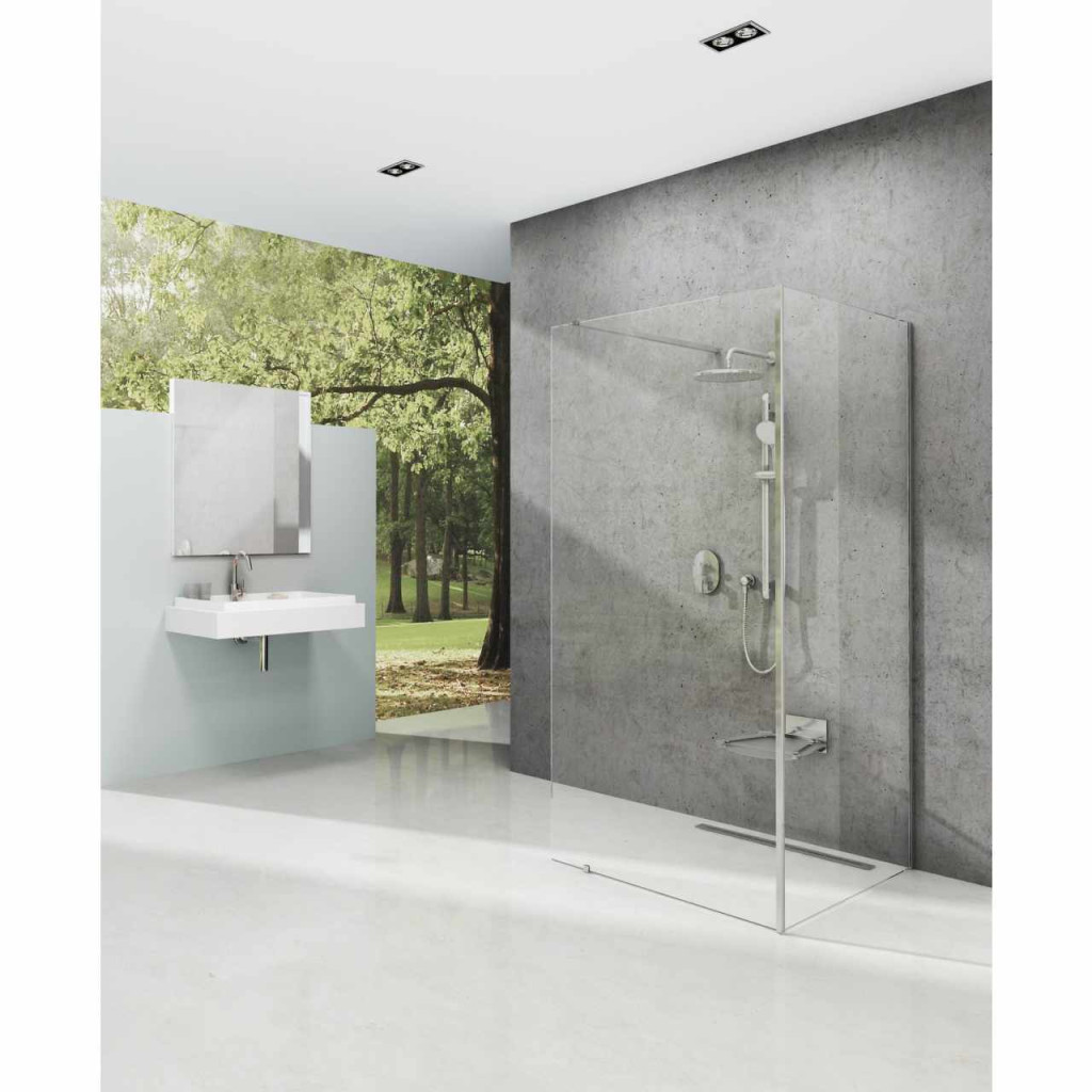 A Walk-In Corner zuhanykabin két darab 8 mm vastag edzett biztonsági üvegből áll, amelyeket sarok csatlakozó profil rögzít. A termék stabilitását egy fém merevítő biztosítja, amely az oldalfallal (üveg) együtt meghatározza a nyitott bejárat szélességét.