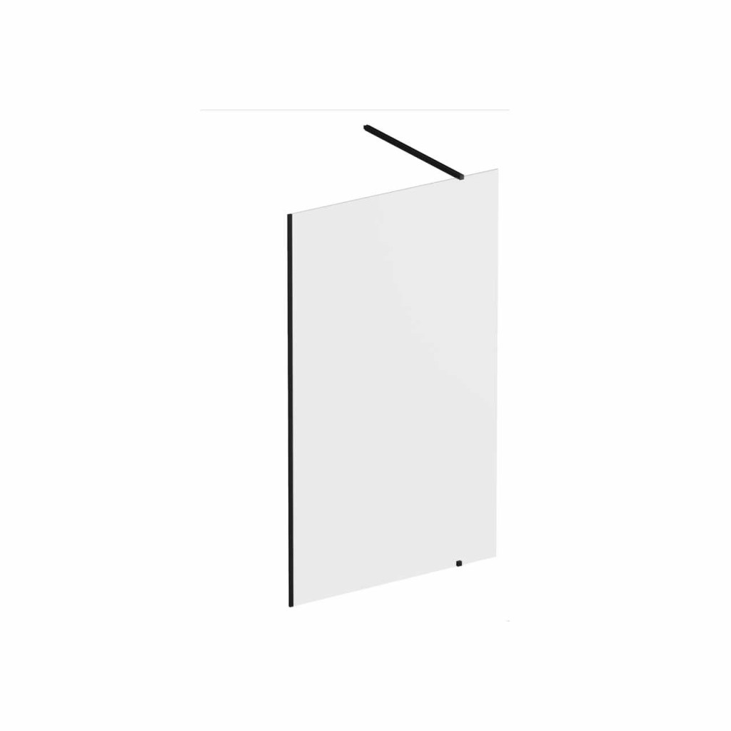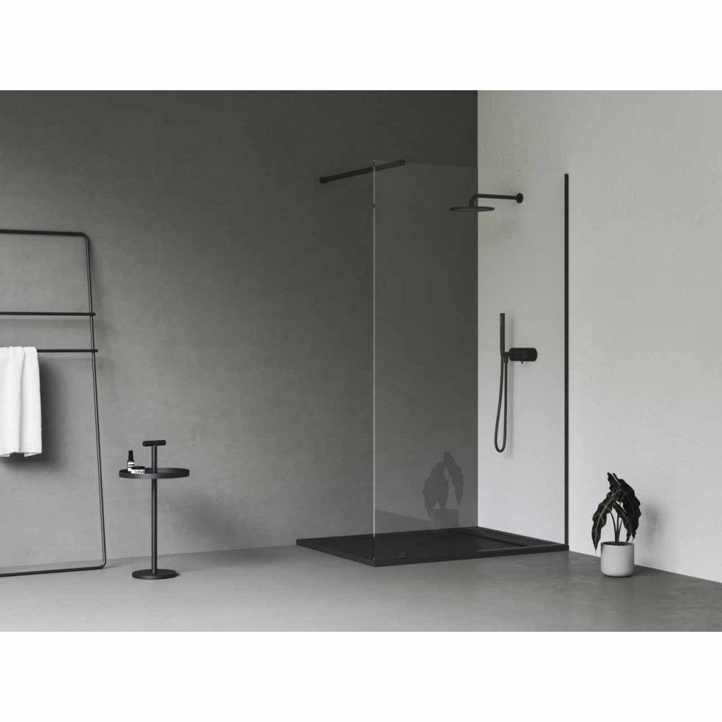 Walk-In Wall zuhanykabin egyik oldalról nyitott bejárattal. Fekete kivitelben, transparent üvegbetéttel és Ravak AntiCalc® védőréteggel. A termék egy fix falból és fém alkatrészekből áll. A zuhanykabin és a bejárat szélessége akár 120 cm-ig választható.