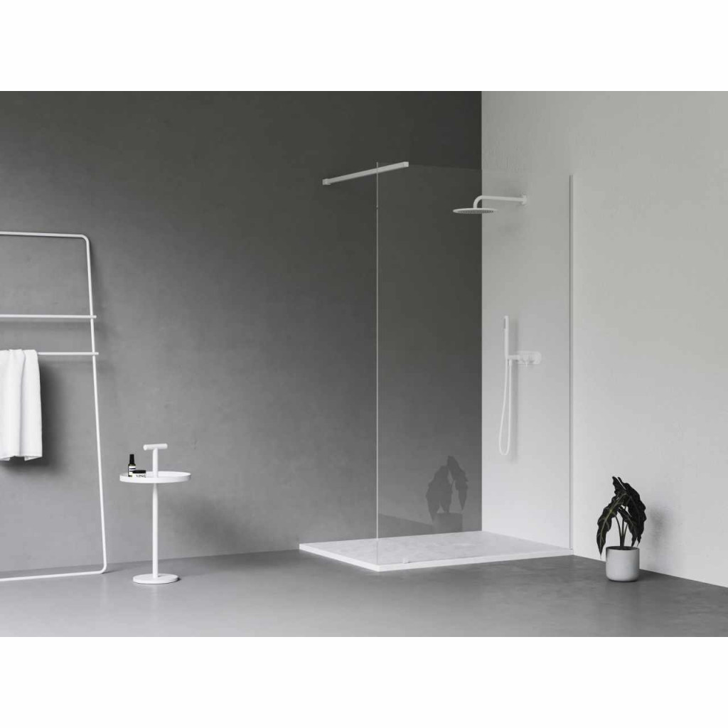 A Walk-In Wall zuhanykabin 8 mm vastag edzett biztonsági üvegből áll. A termék stabilitását egy fém merevítő biztosítja, amely meghatározza a belépés szélességét. A Walk-In Wall zuhanykabin fehér fém alkatrészekkel rendelkezik. Javasoljuk burkolt fürdőszoba sarokba történő telepítését, közvetlenül a padlóra, beépített padlóösszefolyóval vagy zuhanyfolyókával. A zuhanykabin univerzális, a beszereléskor választható jobb vagy bal oldali belépés. A csomag tartalmaz egy fix üvegfalat beállító profilt, fehér kivitelben.