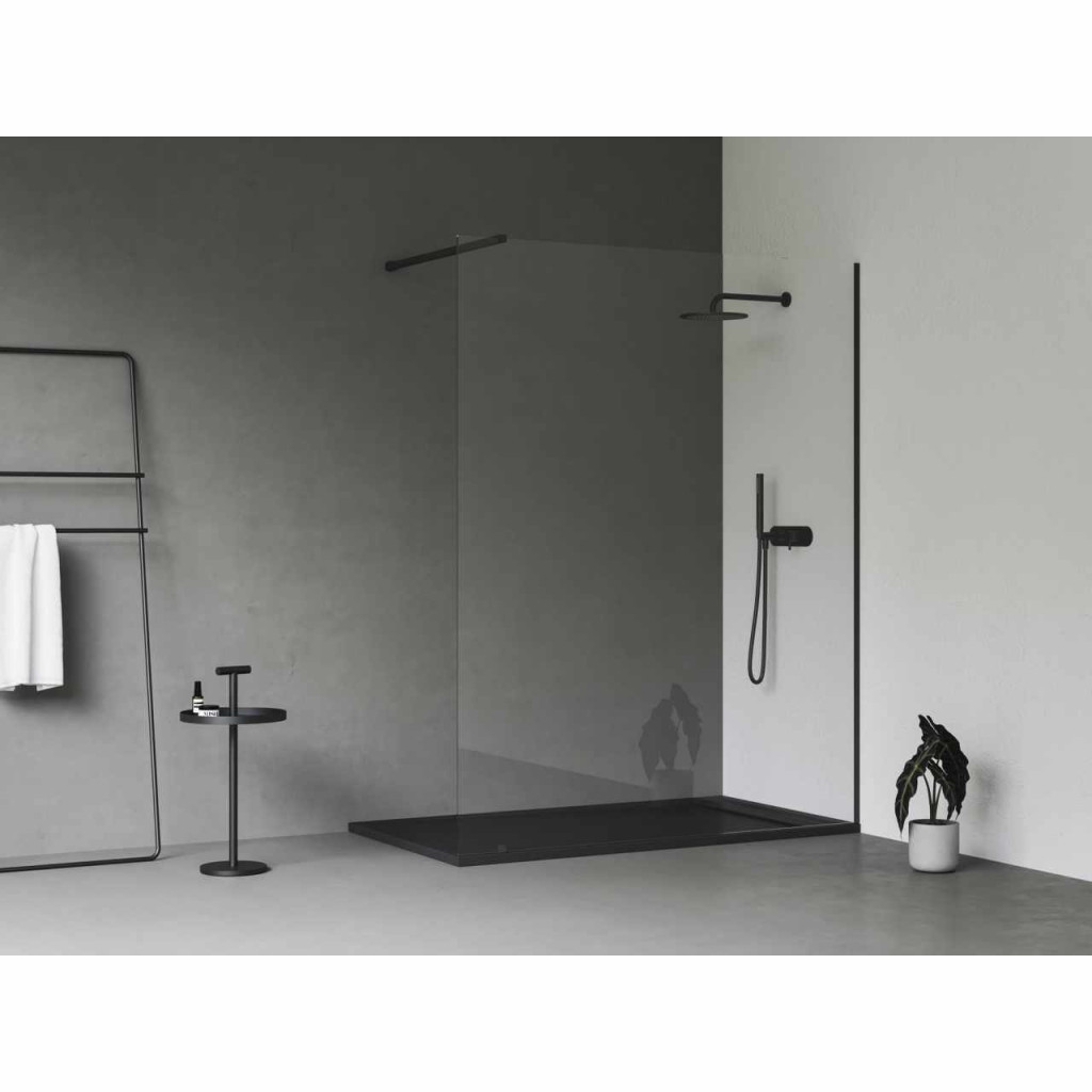 Walk-In Wall zuhanykabin egyik oldalról nyitott bejárattal. Fekete kivitelben, transparent üvegbetéttel és Ravak AntiCalc® védőréteggel. A termék egy fix falból és fém alkatrészekből áll. A zuhanykabin és a bejárat szélessége akár 120 cm-ig választható.