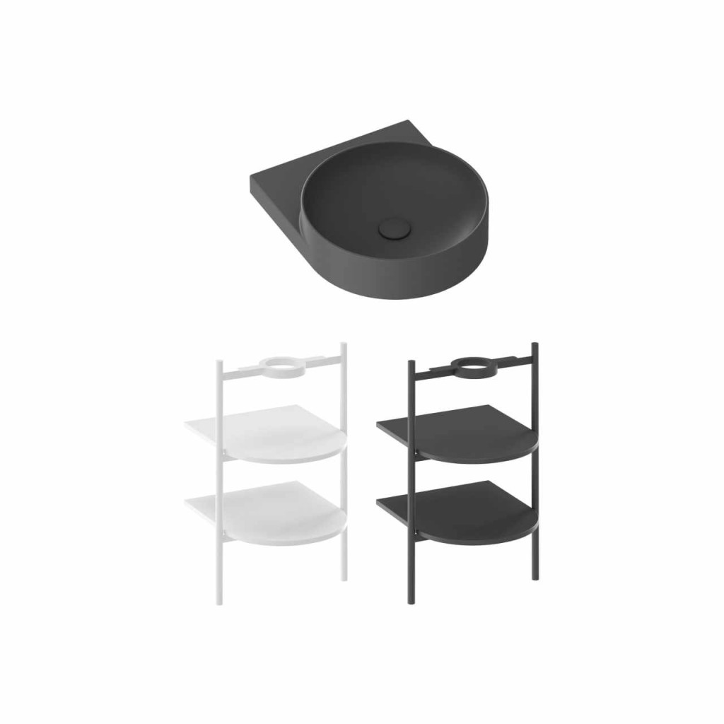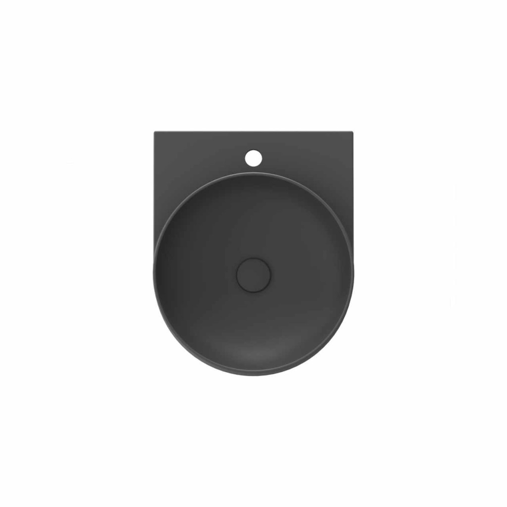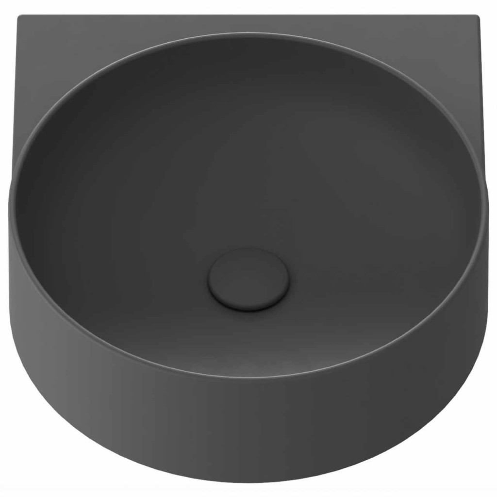 Vékonyfalú kerámia Yard mosdó a Yard konzolhoz vagy a CS Yard 40 mosdó alatti szerkezetre szerelhető, amely nyitott polcos bútordarabként szolgál, túlfolyó nélkül. Antracit kivitel. Lyukkal álló csaptelephez.