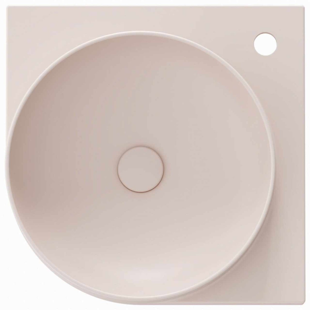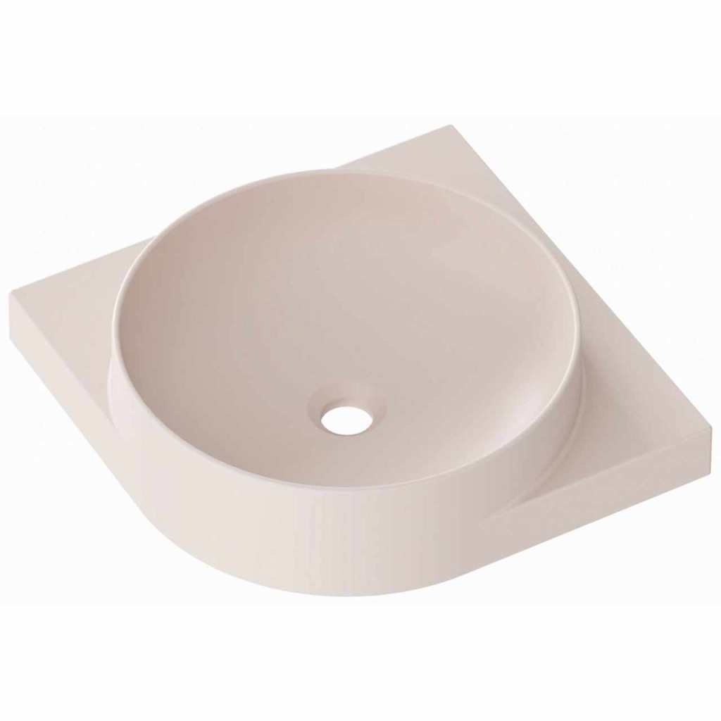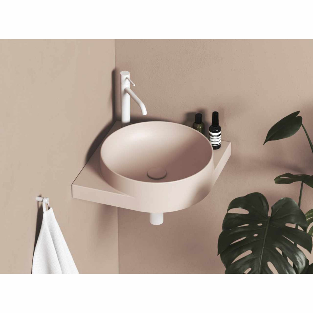 Vékonyfalú kerámia sarokmosdó Yard a Yard konzolra szerelhető, túlfolyó nélkül. Alabaster Pink kivitelben. Álló csaptelep lyukkal.