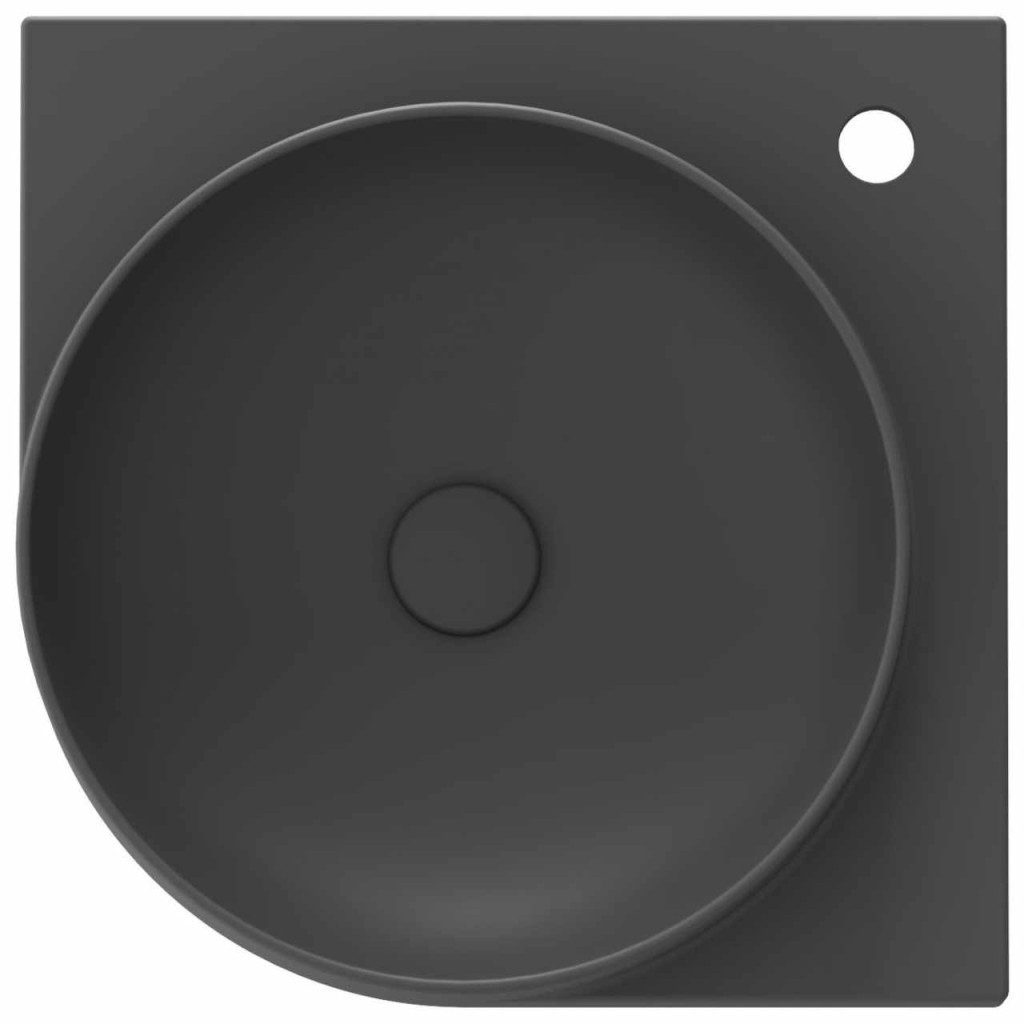 Vékonyfalú kerámia sarokmosdó Yard a Yard konzolra szerelhető, túlfolyó nélkül. Antracit kivitelben. Álló csaptelep lyukkal.