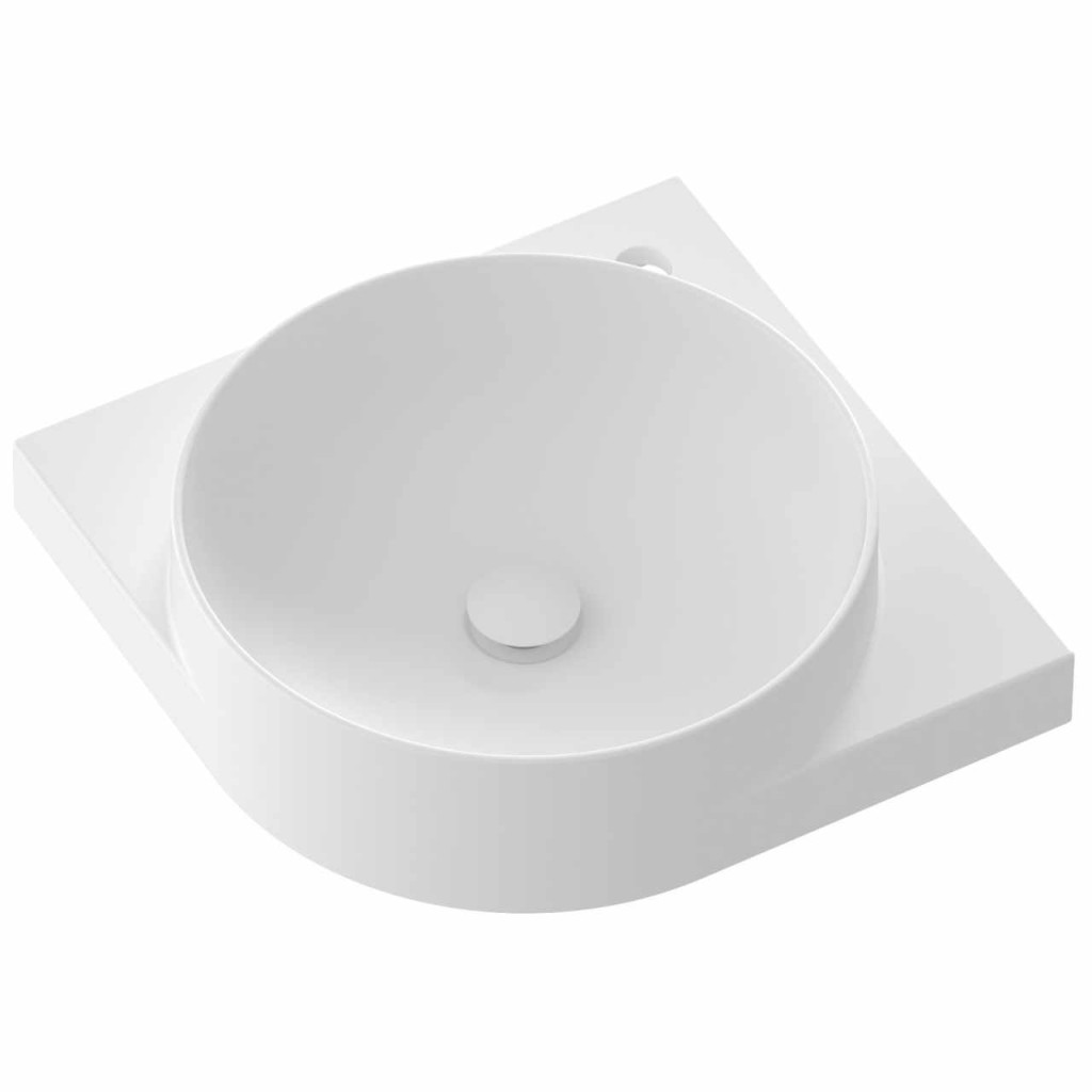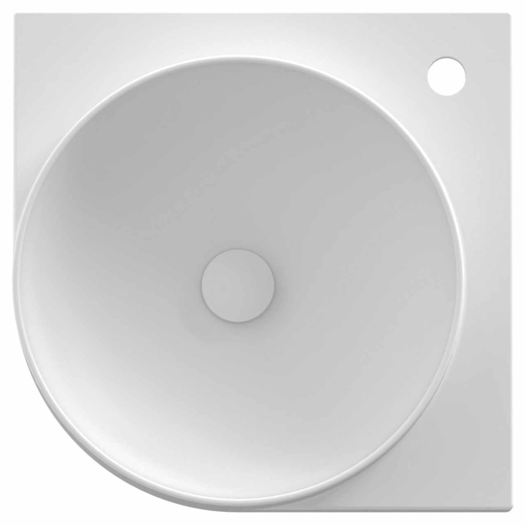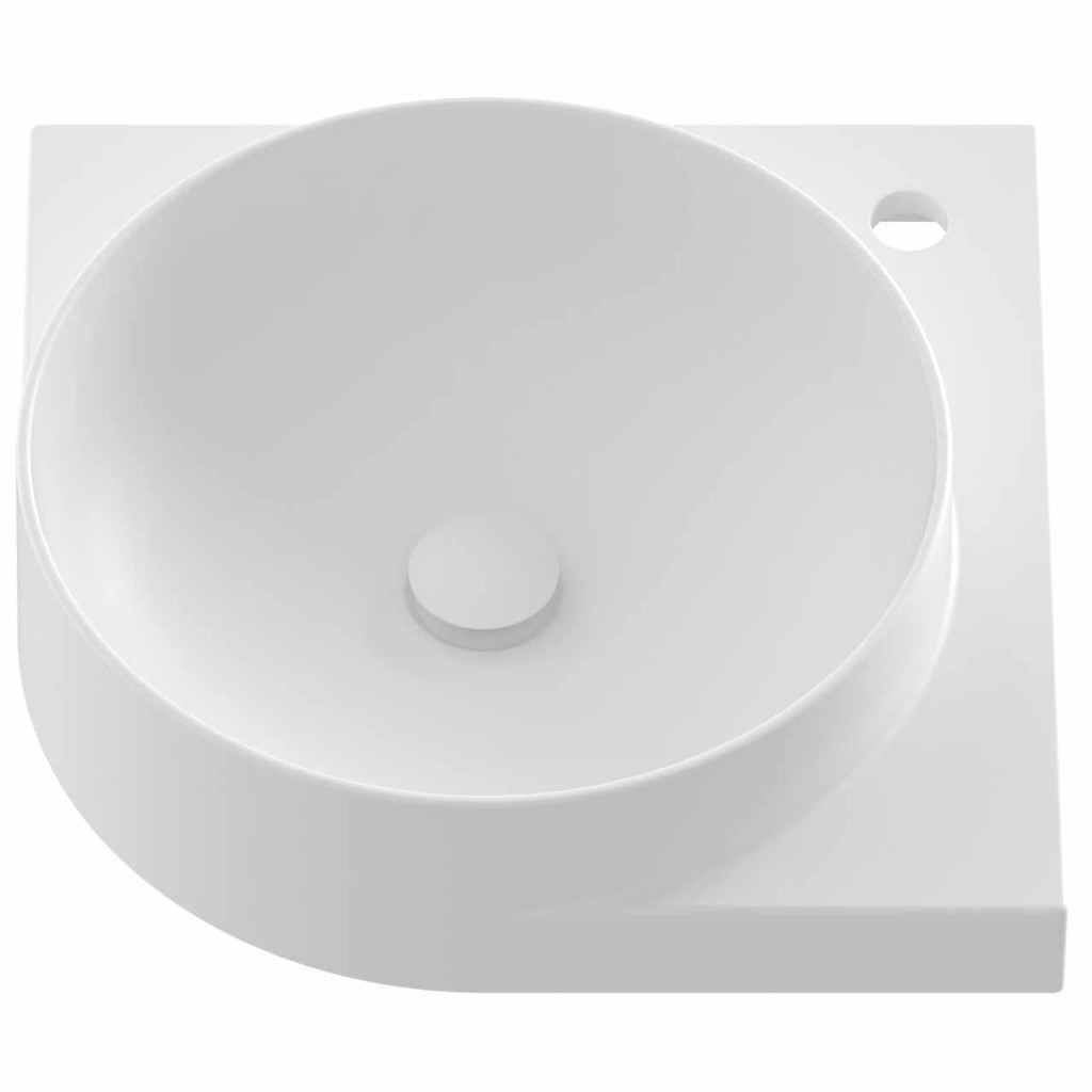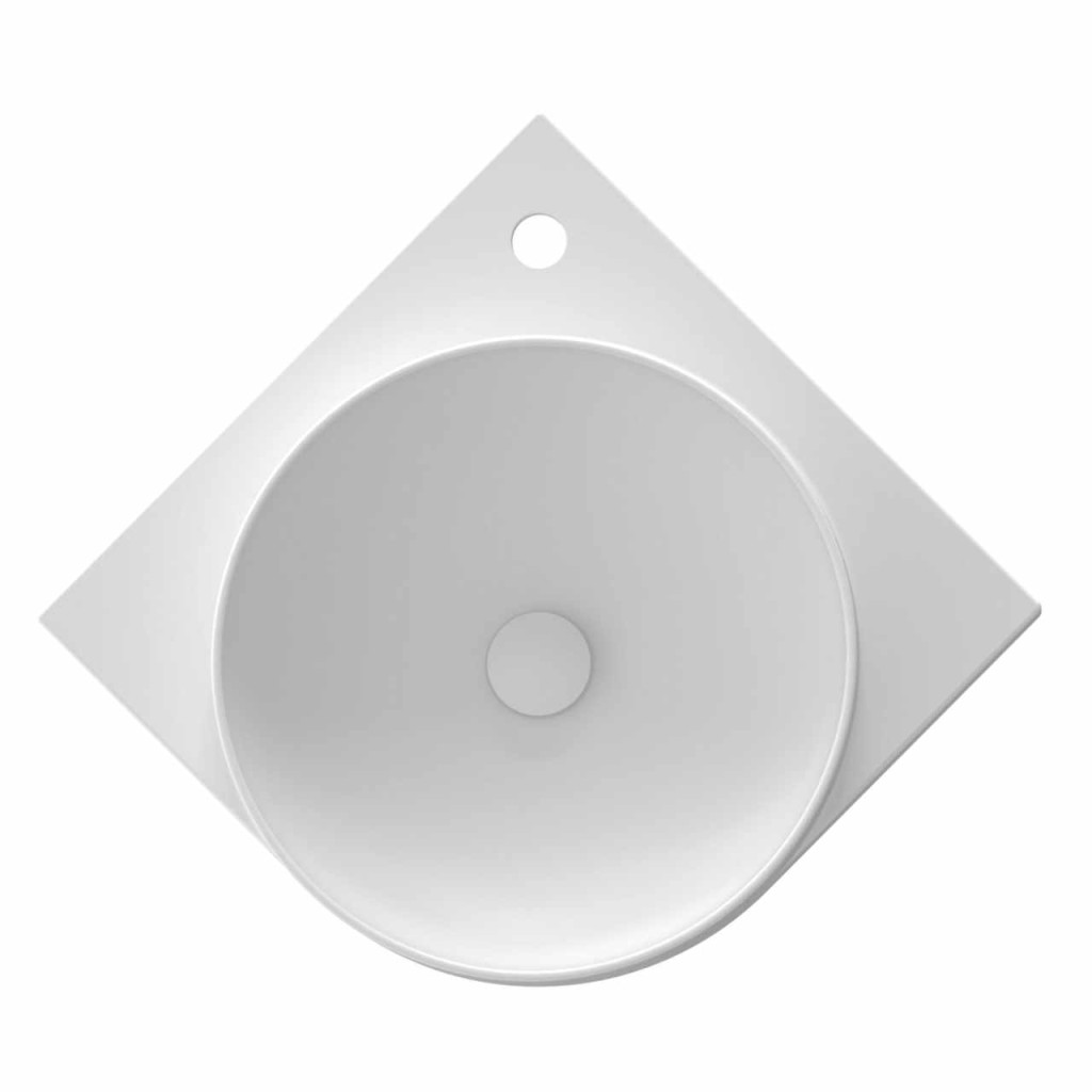 Vékonyfalú kerámia sarokmosdó Yard, Yard konzolra szerelhető, túlfolyó nélkül. Matt fehér kivitelben. Álló csaptelep lyukkal.