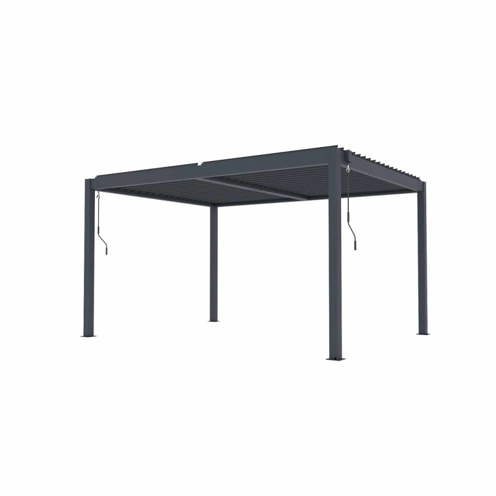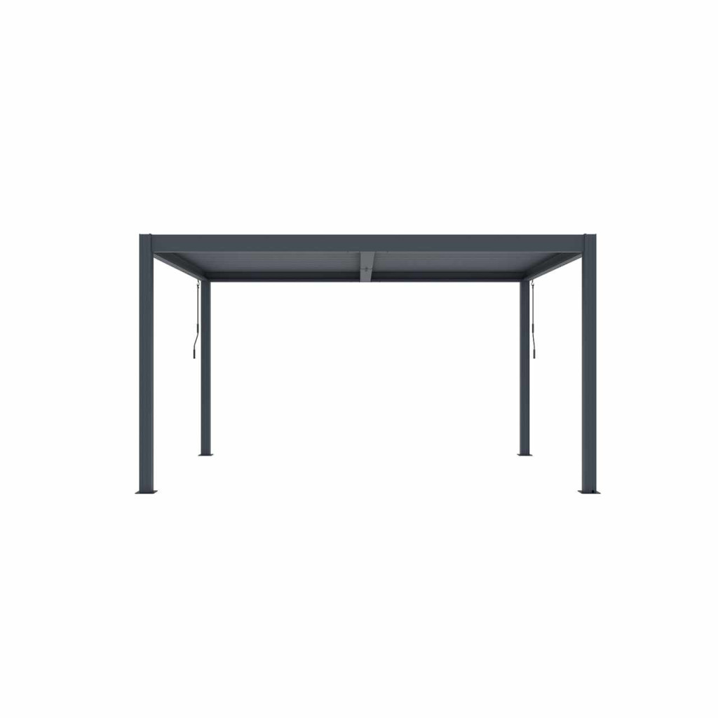 A 4 x 3 méteres, szabadon álló LANITPLAST BASIC bioklimatikus pergol a praktikus és elegáns megoldás a kertben található kültéri ülősarok fedésére. A robusztus és stabil szerkezet modern antracit színű (RAL 7016) matt felülettel könnyen illeszkedik bármilyen környezetbe, és nem igényel falhoz való rögzítést. Az oszlopok és a tartóprofilok alumíniumból, a forgó lamellák pedig minőségi acélból készültek, mindegyik porfestett (komaxit) bevonattal ellátva. A horganyzott acélból készült tetőlamellák szintén porfestékkel vannak bevonva, ami biztosítja a magas időjárási ellenállóságot. A összesen 38 forgó lamella megbízható védelmet nyújt a nap sugaraival és az esővel szemben. Dőlésszögük fokozatmentesen állítható a teljesen zárt pozíciótól (0°) a 90°-os teljes nyitásig. A lamellák vezérlése manuális, egy praktikus kar segítségével történik, amely úgy van kialakítva, hogy lehessen dönteni, így megakadályozva a pergola felületének megsérülését a kezelés során. Elhelyezkedése emellett lehetővé teszi más kiegészítők, például oldalsó függönyök vagy szúnyoghálók problémamentes használatát anélkül, hogy azok funkcionalitását korlátozná.