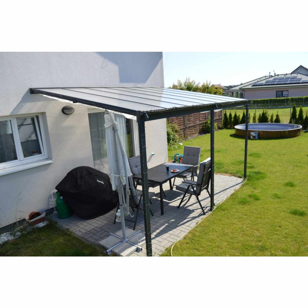 Alumínium pergola a falhoz, méretek 4,35 x 3 m, antracit színű, tető - polikarbonát opal 6 mm .