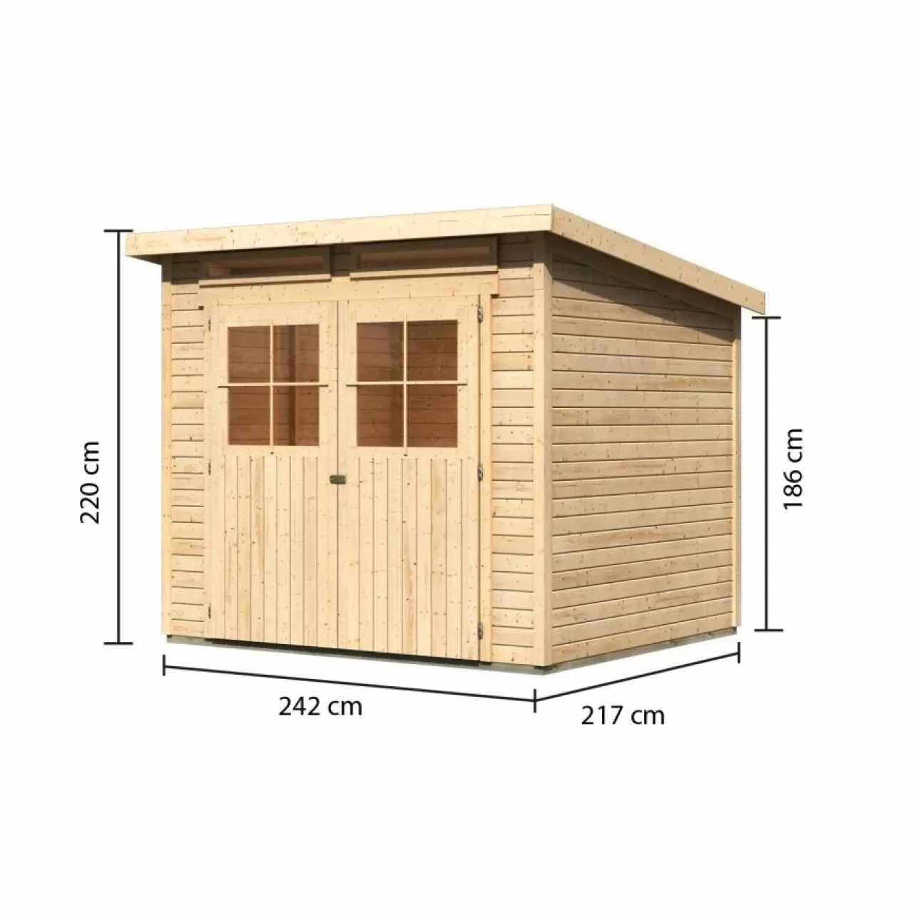 Egy faház alapmodellje kertjébe. Ez a modell lapos tetővel és dupla csuklós ajtókkal rendelkezik, mindkét szárnyban ablakkal. A ház építőanyaga 19 mm vastagságú, északi lucfenyőből tökéletesen mart faprofil. Bontott állapotban készletben szállítjuk, ahol a falak egyedi faprofilokból állnak, amelyeket egyszerűen össze kell rakni és összecsavarozni, a tető egyetlen deszkából. Ez rendkívül egyszerű összeszerelést garantál, amelyet minden ezermester el tud végezni.