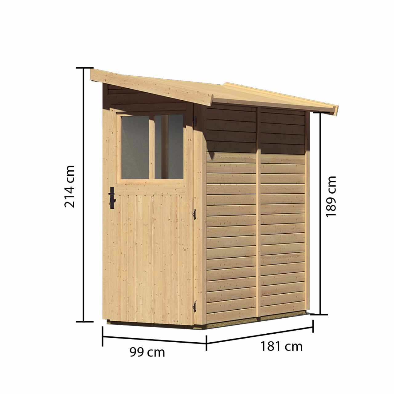 Faház a fal mellett. A házban kerti felszereléseket, szerszámokat tárolhat, vagy barkácsműhelyt építhet. A ház ferde tetővel és egyetlen zsanéros ajtóval rendelkezik, ablakkal. A ház építőanyaga 19 mm vastagságú, északi lucfenyőből tökéletesen mart faprofil. Bontott állapotban készletben szállítjuk, ahol a falak egyedi faprofilokból állnak, amelyeket egyszerűen össze kell rakni és összecsavarozni, a tető egyetlen deszkából. Ez rendkívül egyszerű összeszerelést garantál, amelyet minden ezermester el tud végezni.
