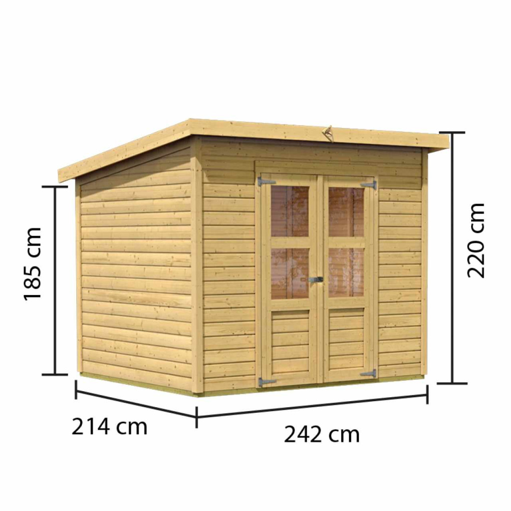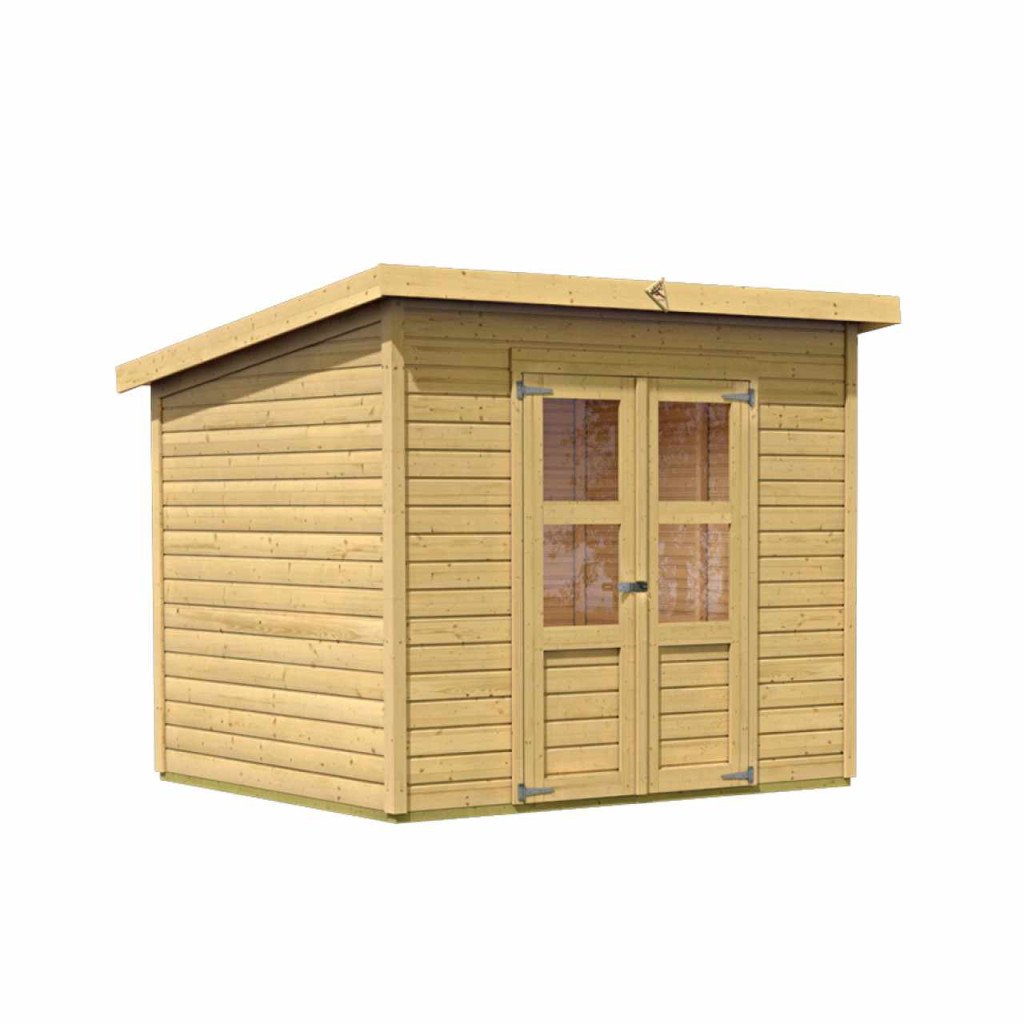 Egy faház alapmodellje kertjébe. Ez a modell lapos tetővel és dupla csuklós ajtókkal rendelkezik, mindkét szárnyban ablakkal. A ház építőanyaga 14 mm vastagságú, északi lucfenyőből tökéletesen mart faprofil. Bontott állapotban készletben szállítjuk, ahol a falak egyedi faprofilokból állnak, amelyeket egyszerűen össze kell rakni és összecsavarozni, a tető egyetlen deszkából. Ez rendkívül egyszerű összeszerelést garantál, amelyet minden ezermester el tud végezni.