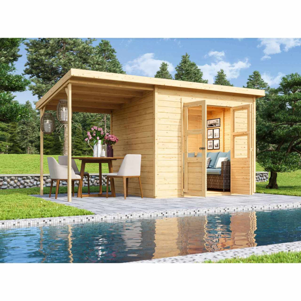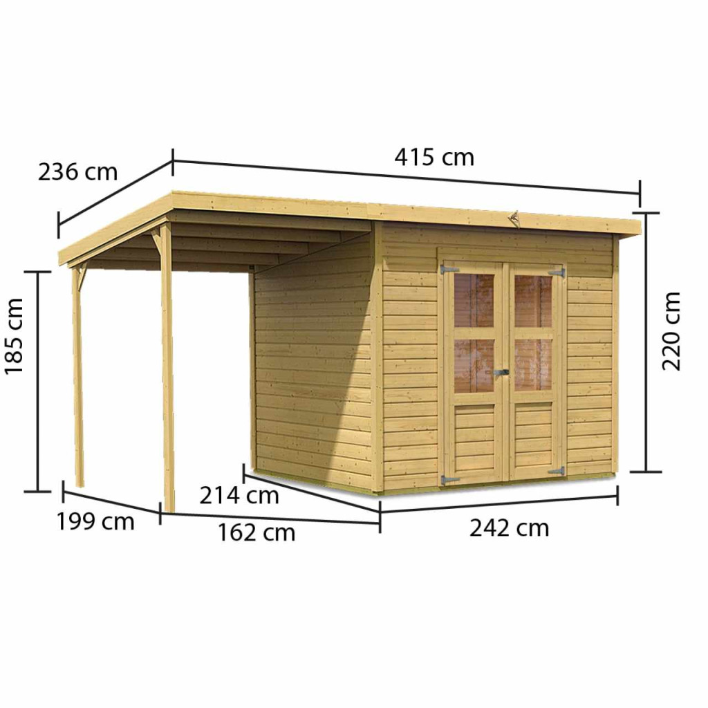 Egy faház alapmodellje kertjébe. Ez a modell lapos tetővel és dupla csuklós ajtókkal rendelkezik, mindkét szárnyban ablakkal. A ház építőanyaga 14 mm vastagságú, északi lucfenyőből tökéletesen mart faprofil. Bontott állapotban készletben szállítjuk, ahol a falak egyedi faprofilokból állnak, amelyeket egyszerűen össze kell rakni és összecsavarozni, a tető egyetlen deszkából. Ez rendkívül egyszerű összeszerelést garantál, amelyet minden ezermester el tud végezni.