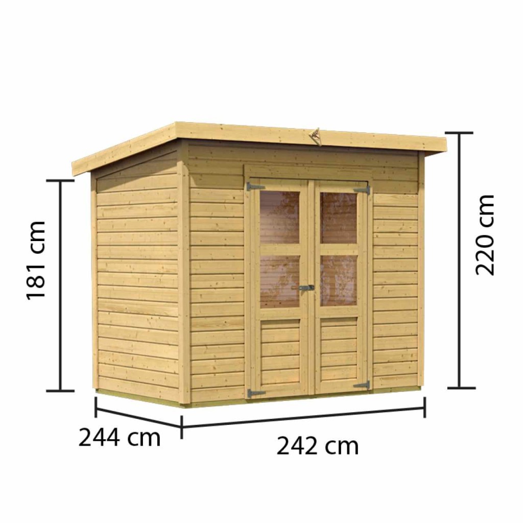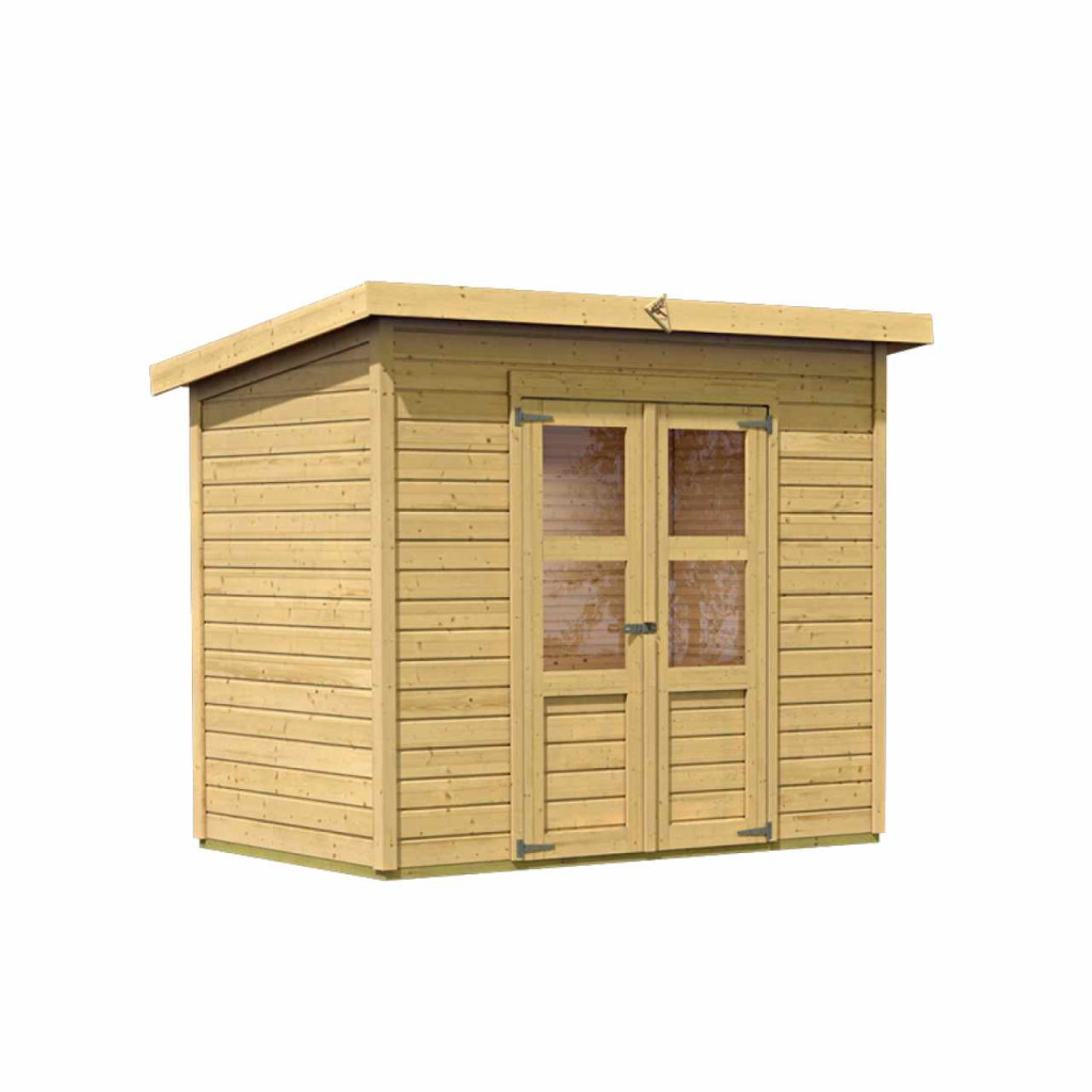Egy faház alapmodellje kertjébe. Ez a modell lapos tetővel és dupla csuklós ajtókkal rendelkezik, mindkét szárnyban ablakkal. A ház építőanyaga 14 mm vastagságú, északi lucfenyőből tökéletesen mart faprofil. Bontott állapotban készletben szállítjuk, ahol a falak egyedi faprofilokból állnak, amelyeket egyszerűen össze kell rakni és összecsavarozni, a tető egyetlen deszkából. Ez rendkívül egyszerű összeszerelést garantál, amelyet minden ezermester el tud végezni.