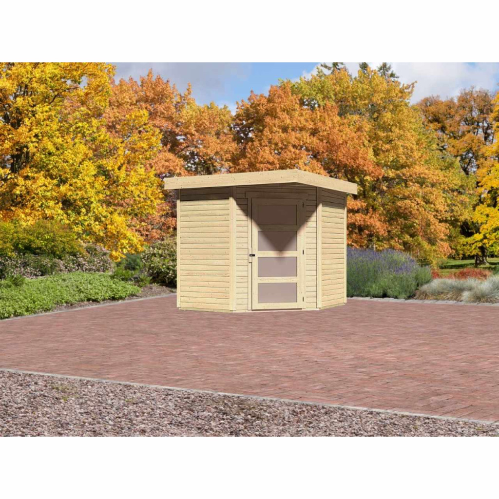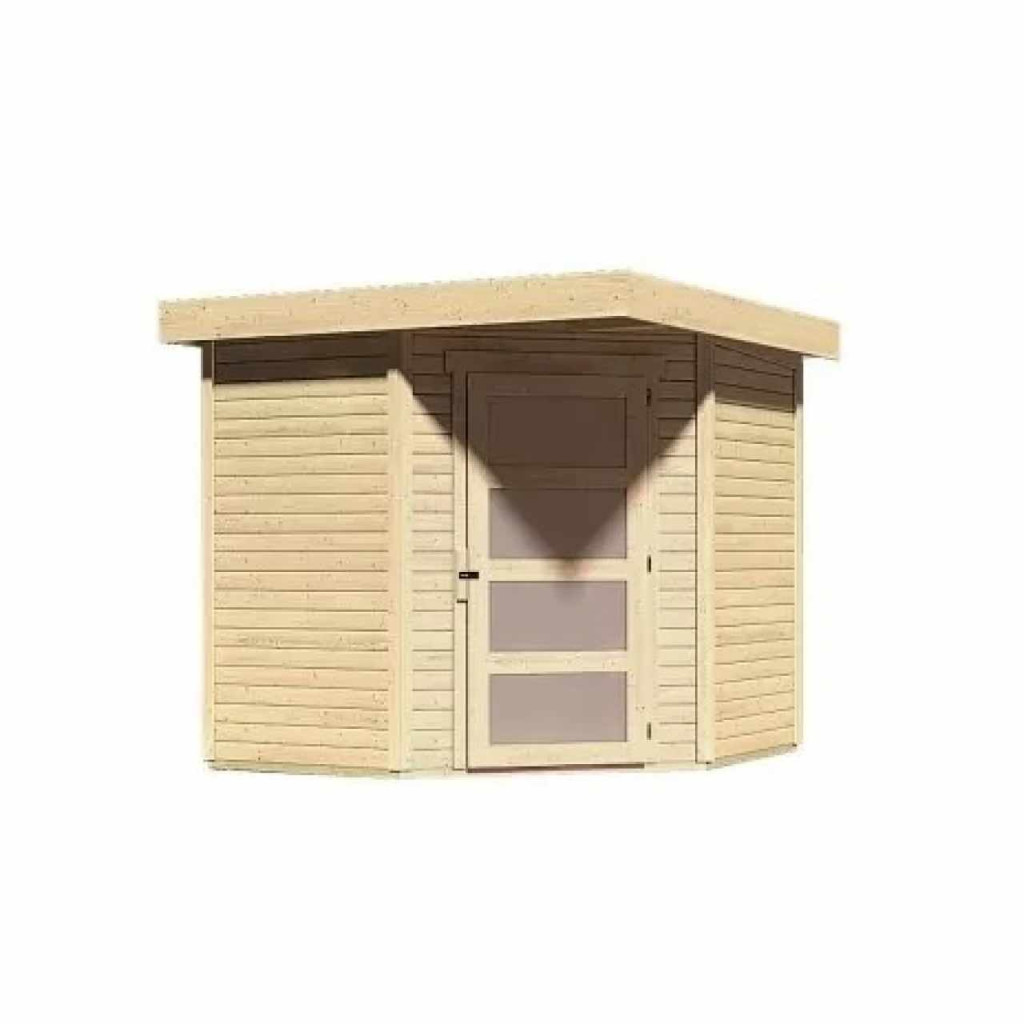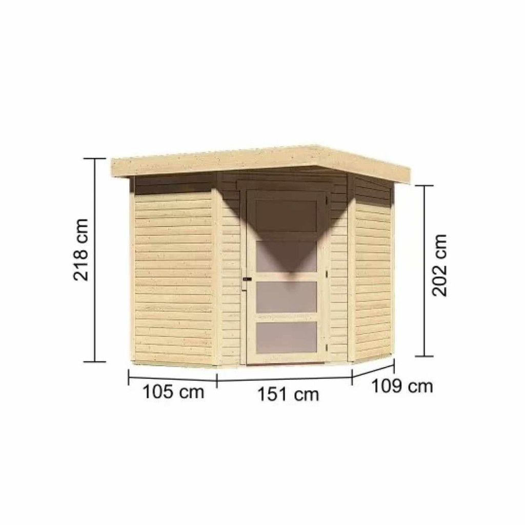 Sarokfaház alapmodellje kertjébe. Ez a modell lapostetővel és egyszárnyú csuklós ajtókkal rendelkezik. A ház építőanyaga 19 mm vastag, északi lucfenyőből tökéletesen mart faprofil. Bontott állapotban készletben szállítjuk, ahol a falak egyedi faprofilokból készülnek, amelyeket egyszerűen össze kell rakni és összecsavarozni. Ez garantálja a rendkívül egyszerű összeszerelést, amelyet bármely barkácsoló meg tud kezelni.