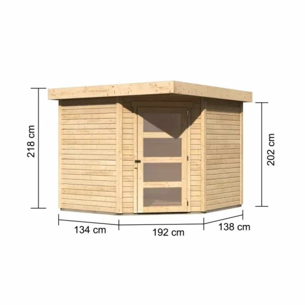 Sarokfaház alapmodellje kertjébe. Ez a modell lapostetővel és egyszárnyú csuklós ajtókkal rendelkezik. A ház építőanyaga 19 mm vastag, északi lucfenyőből tökéletesen mart faprofil. Bontott állapotban készletben szállítjuk, ahol a falak egyedi faprofilokból készülnek, amelyeket egyszerűen össze kell rakni és összecsavarozni. Ez garantálja a rendkívül egyszerű összeszerelést, amelyet bármely barkácsoló meg tud kezelni.