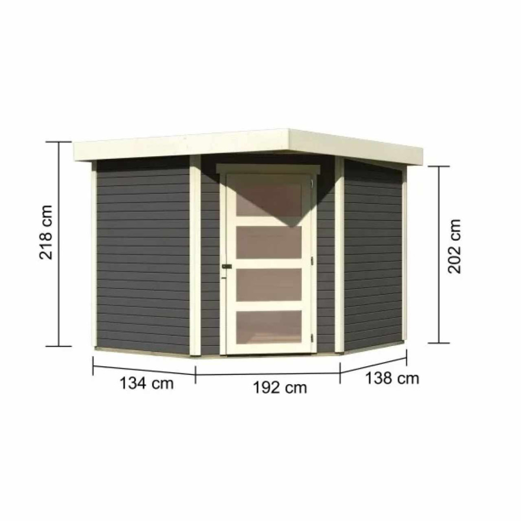 Sarokfaház alapmodellje kertjébe. Ez a modell lapostetővel és egyszárnyú csuklós ajtókkal rendelkezik. A ház építőanyaga 19 mm vastag, északi lucfenyőből tökéletesen mart faprofil. Bontott állapotban készletben szállítjuk, ahol a falak egyedi faprofilokból készülnek, amelyeket egyszerűen össze kell rakni és összecsavarozni. Ez garantálja a rendkívül egyszerű összeszerelést, amelyet bármely barkácsoló meg tud kezelni.