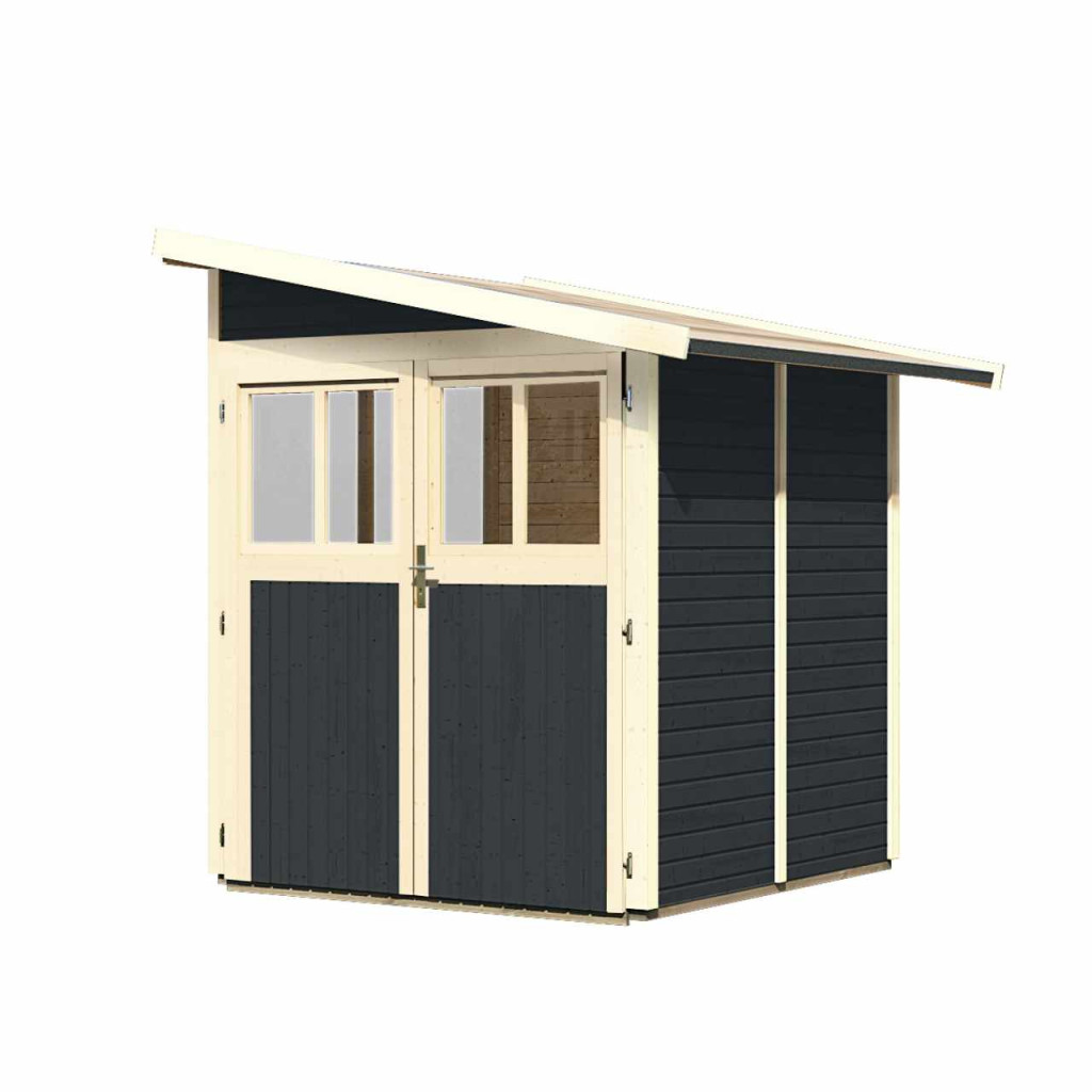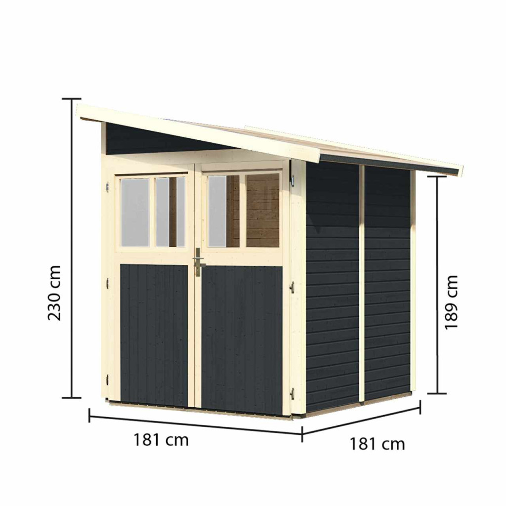 Faház a fal mellett. A házban kerti felszereléseket, szerszámokat tárolhat, vagy barkácsműhelyt építhet. A ház ferde tetővel és egy dupla zsanéros ajtóval rendelkezik, mindkét szárnyban ablakkal. A ház építőanyaga 19 mm vastagságú, északi lucfenyőből tökéletesen mart faprofil. Bontott állapotban készletben szállítjuk, ahol a falak egyedi faprofilokból állnak, amelyeket egyszerűen össze kell rakni és összecsavarozni, a tető egyetlen deszkából. Ez rendkívül egyszerű összeszerelést garantál, amelyet minden ezermester el tud végezni.