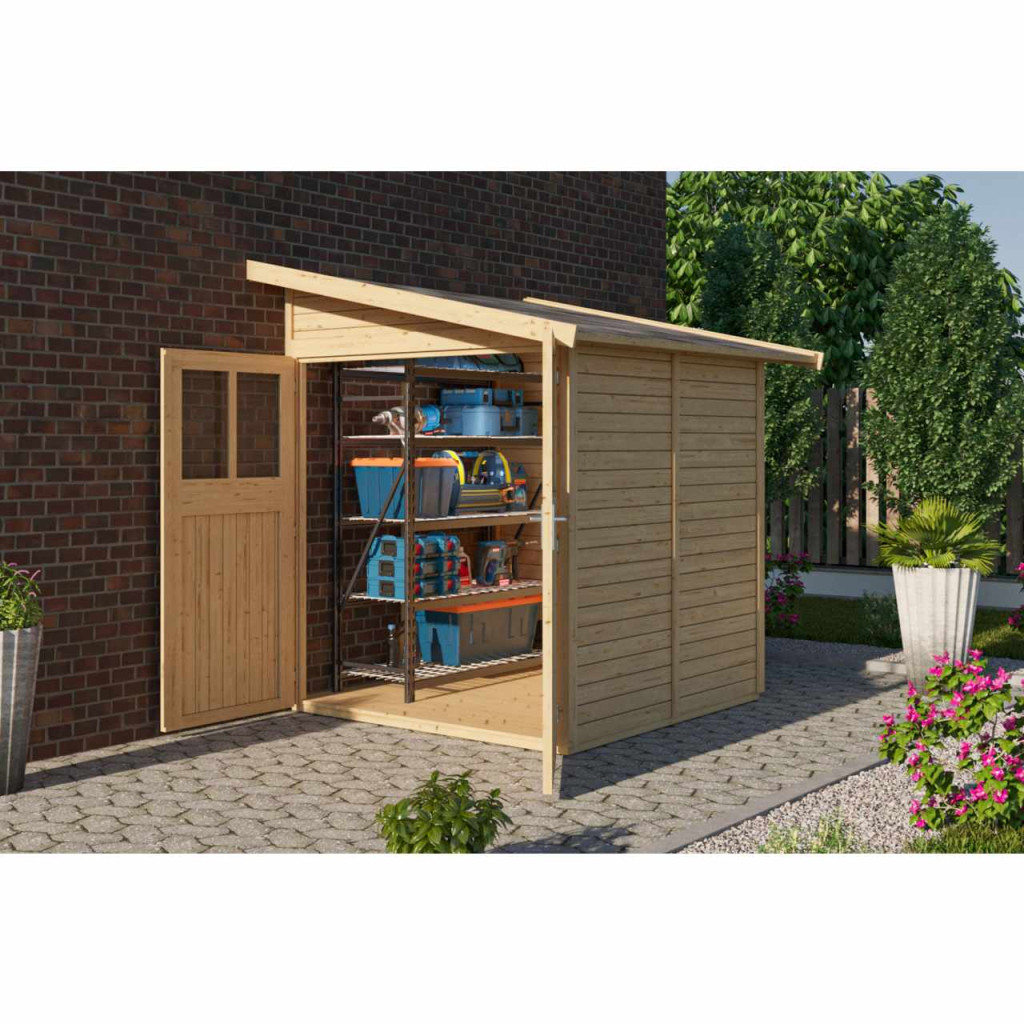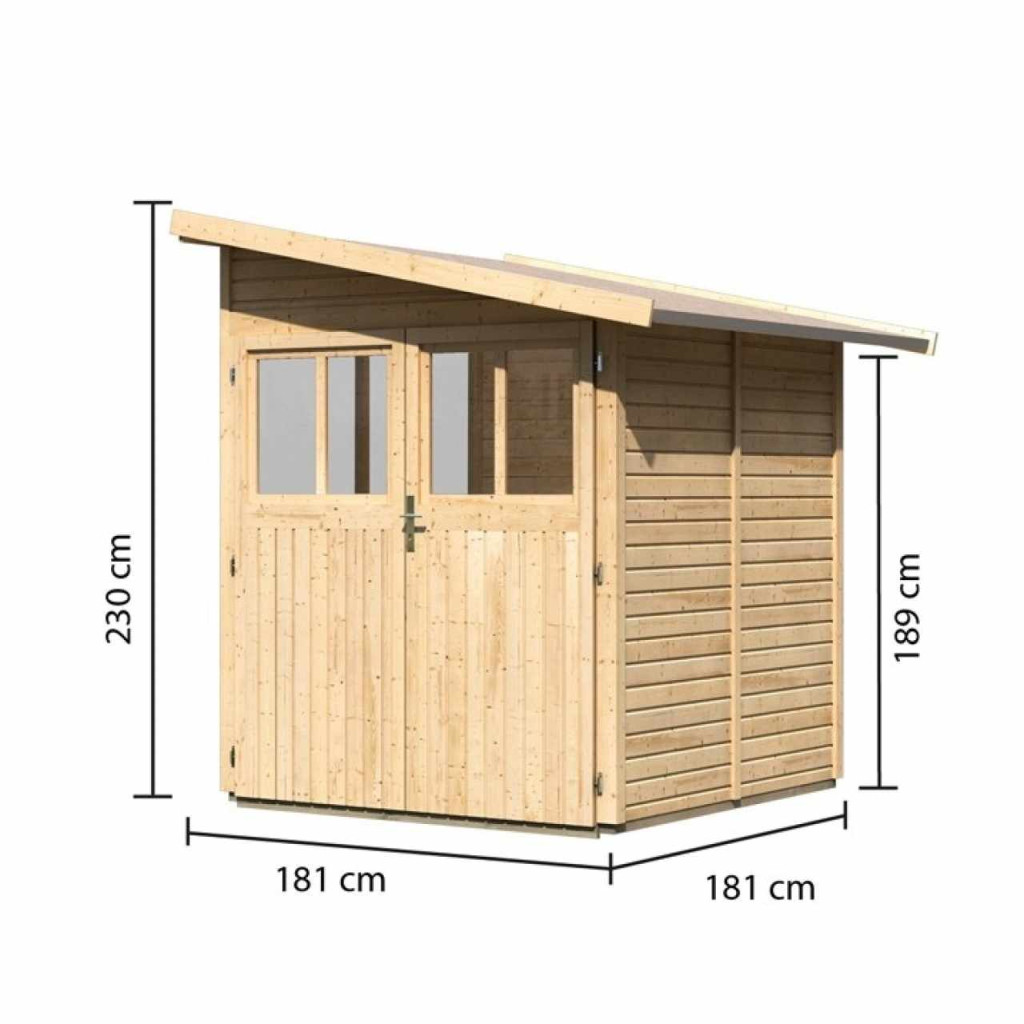 Faház a fal mellett. A házban kerti felszereléseket, szerszámokat tárolhat, vagy barkácsműhelyt építhet. A ház ferde tetővel és egy dupla zsanéros ajtóval rendelkezik, mindkét szárnyban ablakkal. A ház építőanyaga 19 mm vastagságú, északi lucfenyőből tökéletesen mart faprofil. Bontott állapotban készletben szállítjuk, ahol a falak egyedi faprofilokból állnak, amelyeket egyszerűen össze kell rakni és összecsavarozni, a tető egyetlen deszkából. Ez rendkívül egyszerű összeszerelést garantál, amelyet minden ezermester el tud végezni.