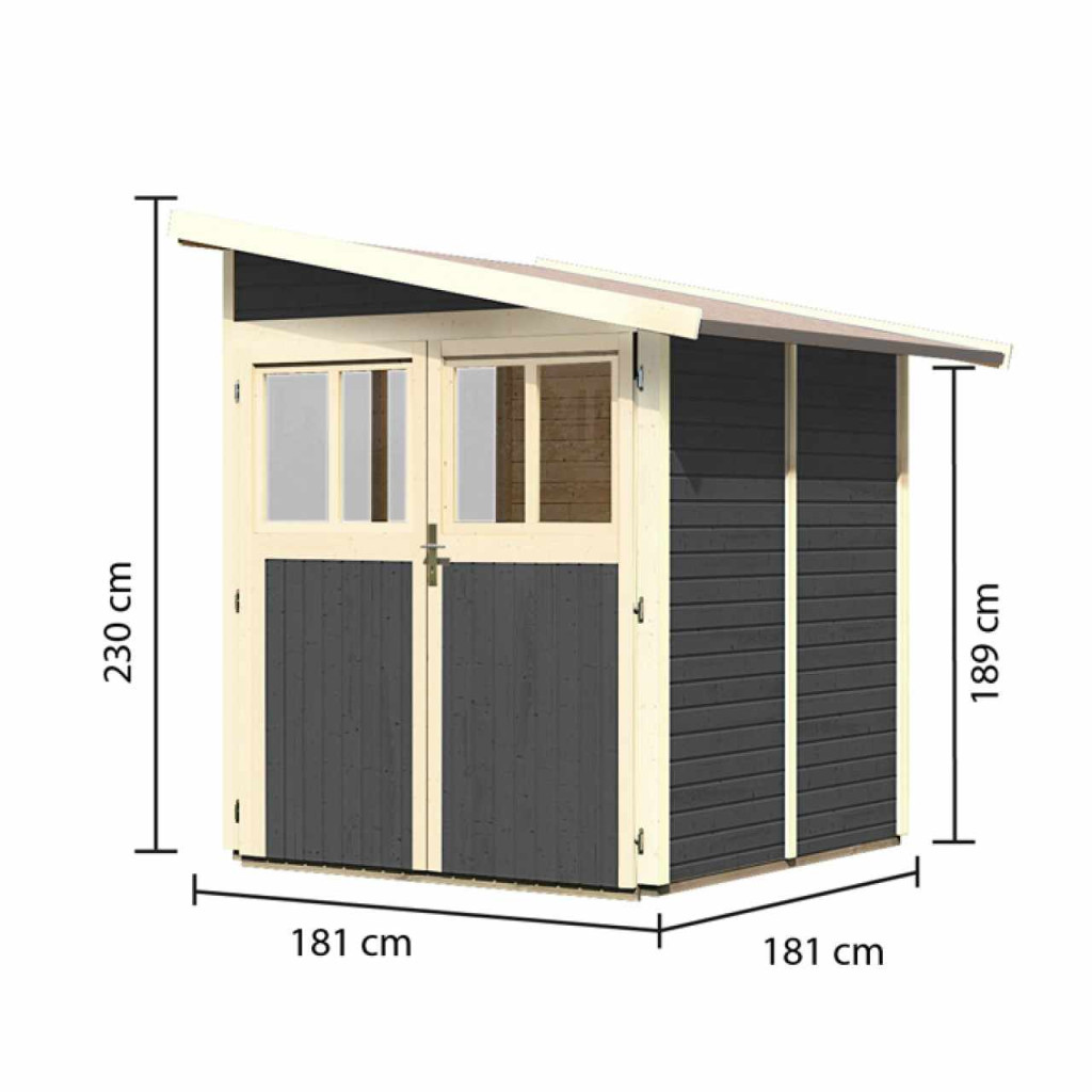 Faház a fal mellett. A házban kerti felszereléseket, szerszámokat tárolhat, vagy barkácsműhelyt építhet. A ház ferde tetővel és egy dupla zsanéros ajtóval rendelkezik, mindkét szárnyban ablakkal. A ház építőanyaga 19 mm vastagságú, északi lucfenyőből tökéletesen mart faprofil. Bontott állapotban készletben szállítjuk, ahol a falak egyedi faprofilokból állnak, amelyeket egyszerűen össze kell rakni és összecsavarozni, a tető egyetlen deszkából. Ez rendkívül egyszerű összeszerelést garantál, amelyet minden ezermester el tud végezni.