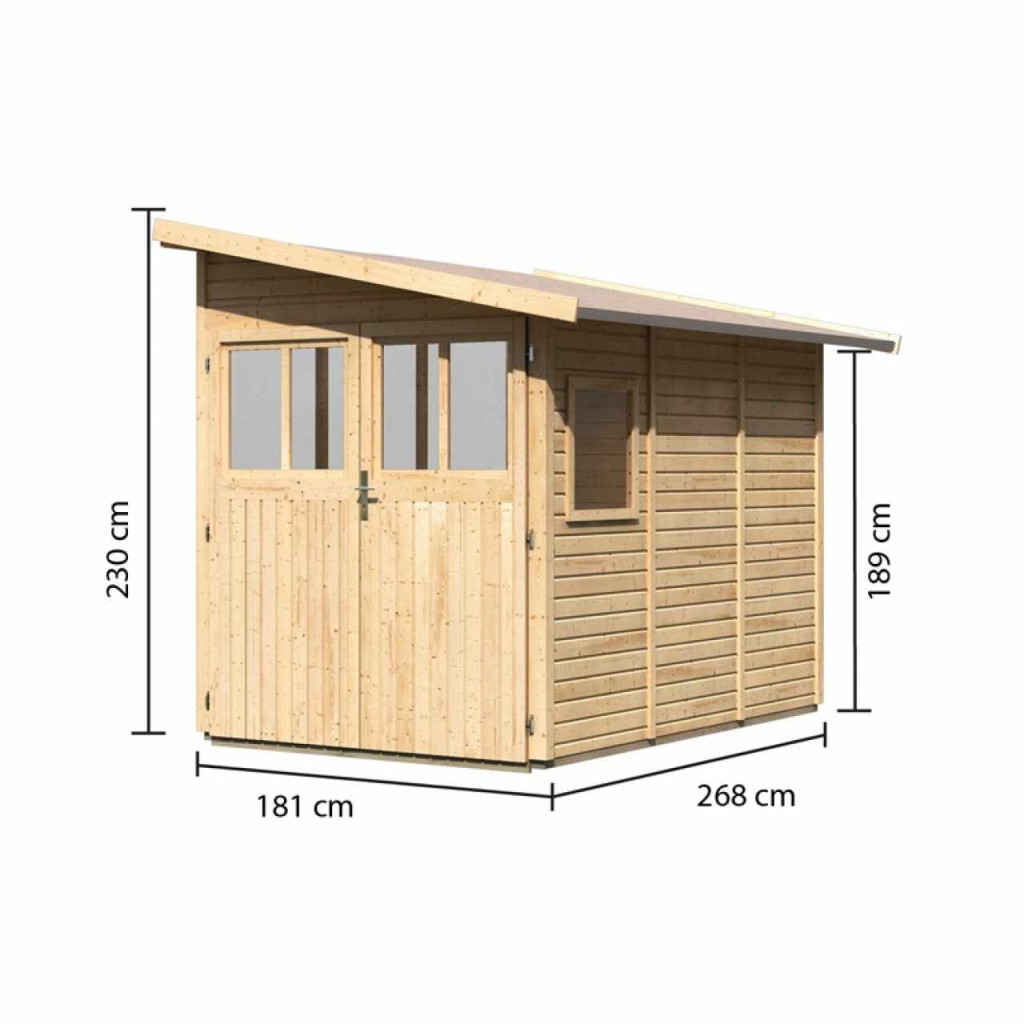 Faház a fal mellett. A házban kerti felszereléseket, szerszámokat tárolhat, vagy barkácsműhelyt építhet. A ház ferde tetővel és egy dupla zsanéros ajtóval rendelkezik, mindkét szárnyban ablakkal. A ház építőanyaga 19 mm vastagságú, északi lucfenyőből tökéletesen mart faprofil. Bontott állapotban készletben szállítjuk, ahol a falak egyedi faprofilokból állnak, amelyeket egyszerűen össze kell rakni és összecsavarozni, a tető egyetlen deszkából. Ez rendkívül egyszerű összeszerelést garantál, amelyet minden ezermester el tud végezni.