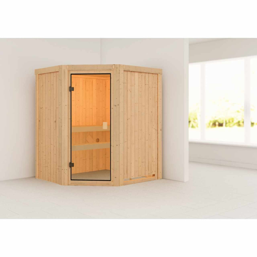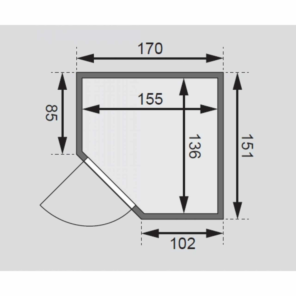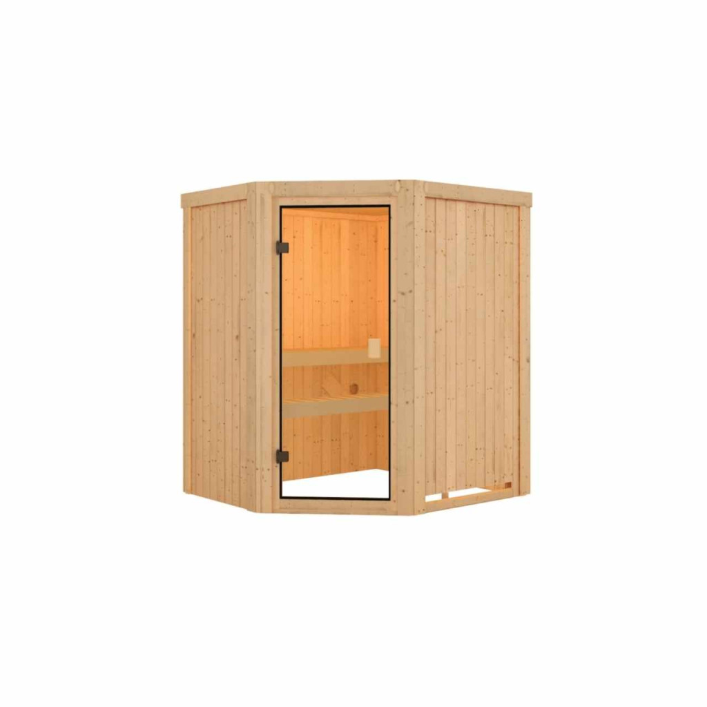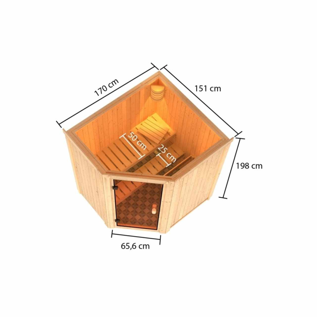 Kisebb finn szauna két személyre tervezve. Méretek sz 170 x mé 151 x ma 198 cm, sarokajtóval. Ezt a finn szaunamodellt egy ház vagy lakás temperált belső teréhez tervezték. Gyártója, a brémai KARIBU HOLZTECHNIK sikeresen építkezik termékeivel a skandináv szaunák évszázados hagyományaira, miközben a mai modern technológiát is beépíti.
