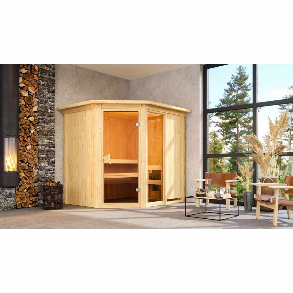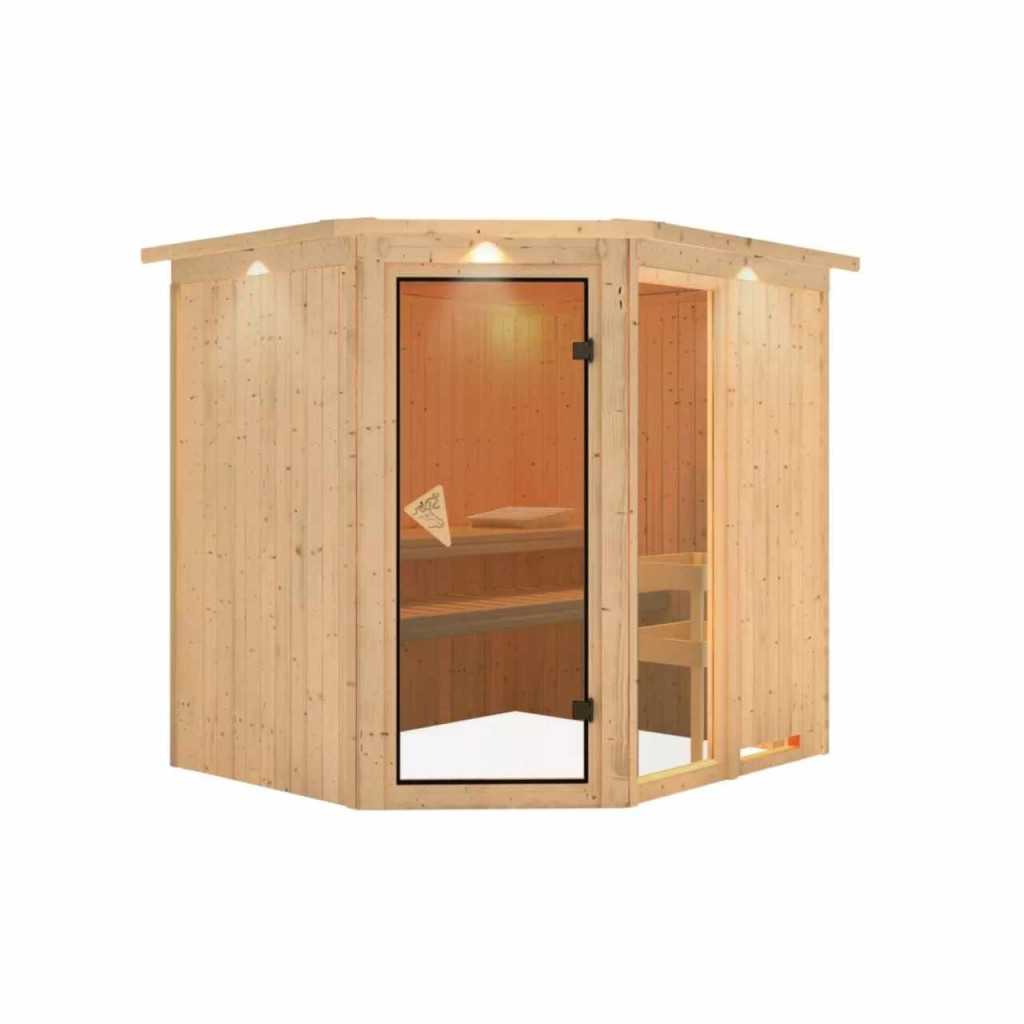 Két személyes finn szauna. Mérete: sz 196 x mé 170 x ma 198 cm, sarokajtóval. Ez a finn szauna modell 1 ablakkal rendelkezik, melynek 49 x 175,5 cm. A szauna egy ház vagy lakás fűtött belső tereihez készült. Gyártója, a németországi brémai KARIBU HOLZTECHNIK cég termékeivel sikeresen építhetett a skandináv szaunák több évszázados hagyományára, és egyúttal a mai modern technológiákat is beépíthette abba. A szauna teljes egészében északi lucfából készült, természetes kivitelben. A fa Európa távoli északi részeiről származik, és vegyileg kezeletlen (nem pácolt és nem lakkozott). Ennek köszönhetően mentes minden ismert problémás anyagtól, ami a szaunázás során felszabadulhat a fából. Ez a beltéri szauna kivételes hőszigetelő tulajdonságokkal rendelkezik. A szauna falait speciálisan simított, hornyolt deszkák belső és külső rétege alkotja, melyek között 42 mm vastag ásványgyapot formájú hőszigetelés található. A fal teljes vastagsága így 68 mm. A szauna hátsó része, amely nem látható, farostlemezből készült felülettel támaszkodik a falhoz.