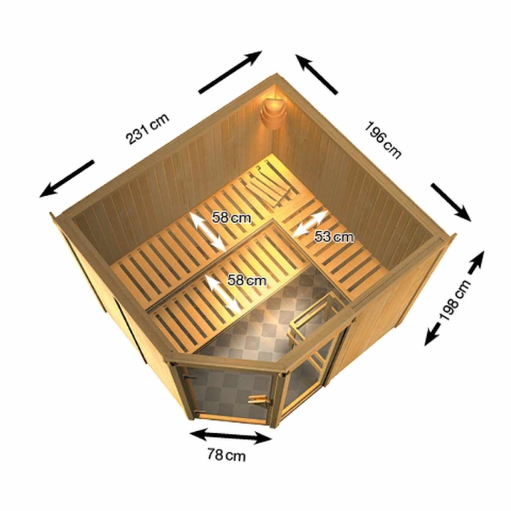 Három személyes finn szauna. Mérete: sz 231 x mé 196 x ma 198 cm, sarokajtóval. Ez a finn szauna modell 1 ablakkal rendelkezik, melynek 49 x 175,5 cm. A szauna egy ház vagy lakás fűtött belső tereihez készült. Gyártója, a németországi brémai KARIBU HOLZTECHNIK cég termékeivel sikeresen építhetett a skandináv szaunák több évszázados hagyományára, és egyúttal a mai modern technológiákat is beépíthette abba. A szauna teljes egészében északi lucfából készült, természetes kivitelben. A fa Európa távoli északi részeiről származik, és vegyileg kezeletlen (nem pácolt és nem lakkozott). Ennek köszönhetően mentes minden ismert problémás anyagtól, ami a szaunázás során felszabadulhat a fából. Ez a beltéri szauna kivételes hőszigetelő tulajdonságokkal rendelkezik. A szauna falait speciálisan simított, hornyolt deszkák belső és külső rétege alkotja, melyek között 42 mm vastag ásványgyapot formájú hőszigetelés található. A fal teljes vastagsága így 68 mm. A szauna hátsó része, amely nem látható, farostlemezből készült felülettel támaszkodik a falhoz.