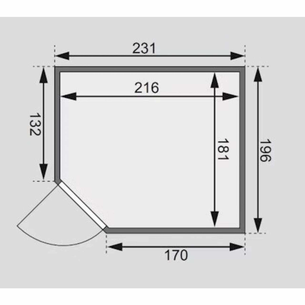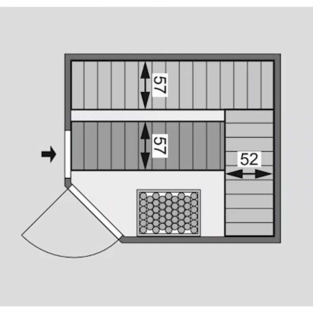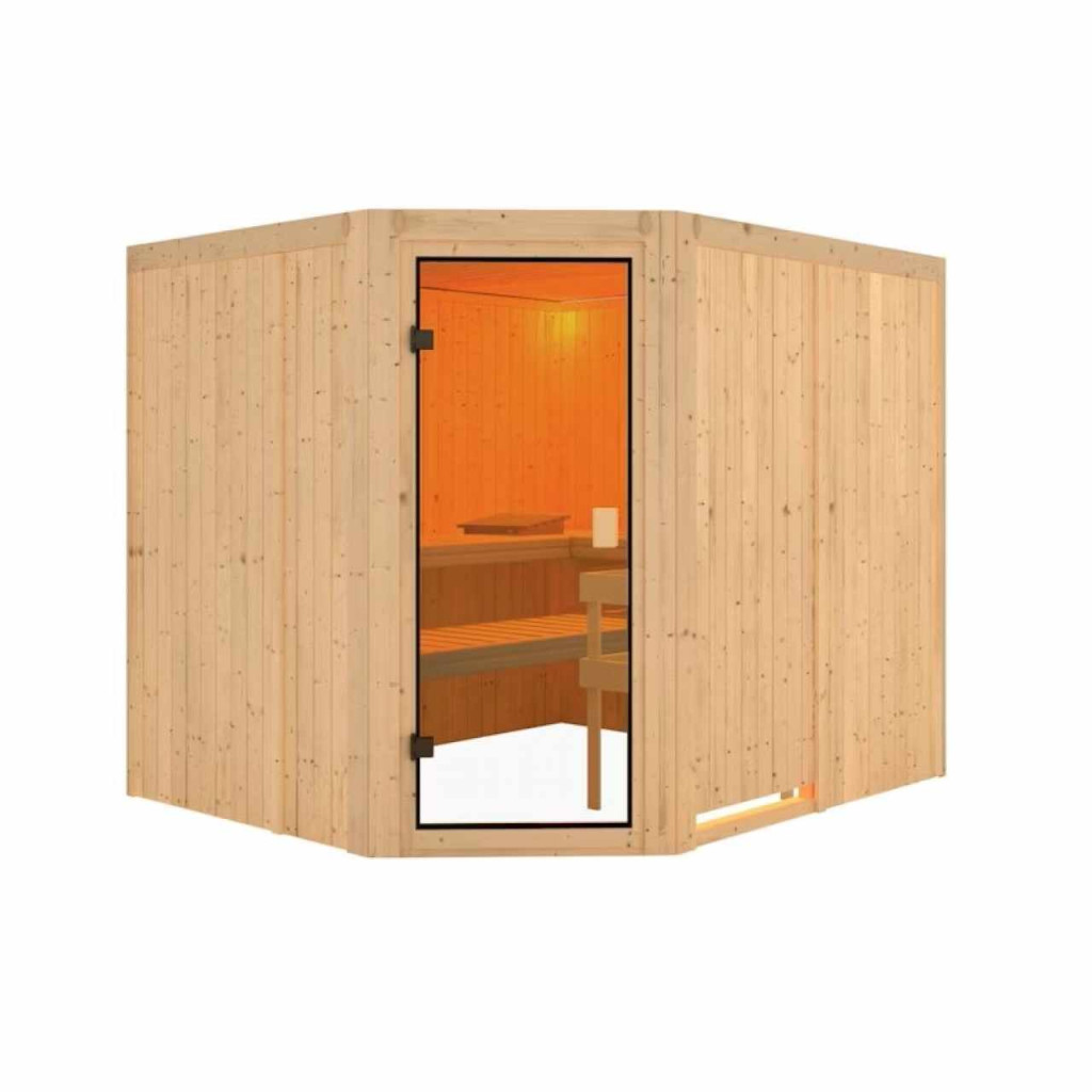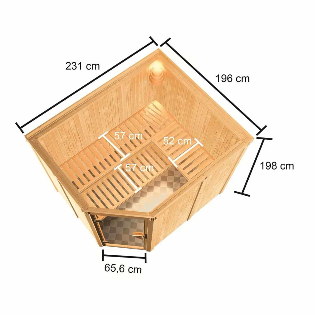 Finn szauna három fekvő személy számára kialakítva. Méretei: sz 231 x mé 196 x ma 198 cm, sarokajtóval. Ezt a finn szaunamodellt egy ház vagy lakás temperált belső teréhez tervezték. Gyártójának, a németországi Brémából származó KARIBU HOLZTECHNIK cégnek sikerült termékeivel sikeresen továbbvinnie a skandináv szaunák évszázados hagyományait, miközben a mai modern technológiát is beépítette. A szauna teljes egészében skandináv lucfenyőfából készült, természetes kivitelben. A fa Európa messzi északi részéről származik, és teljesen vegyszeresen kezeletlen (sem nem pácolt, sem nem lakkozott). Ennek eredményeként mentes minden olyan ismert problémás anyagtól, amely a szaunázás során a fából kioldódhatna. Ez a beltéri szauna kivételes hőszigetelő tulajdonságokkal rendelkezik. A szauna falai speciálisan simára simított, hornyolt deszkák belső és külső rétegéből állnak, amelyek között 42 mm vastag hőszigetelés található ásványgyapot formájában. A fal teljes vastagsága így 68 mm. A szauna hátsó, nem látható oldala farostlemezzel borított, amely a fal felé néz. Ezért azonos hőszigetelés mellett kb. 10 mm-rel vékonyabb, mint a deszkákkal borított nézeti oldalak.