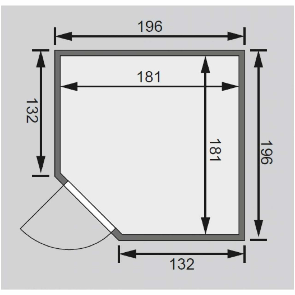 Ez a fajta finn szauna legfeljebb két fő részére lett tervezve. Ezt a finn szaunamodellt egy ház vagy lakás temperált belső teréhez tervezték. Méretek sz 196 x mé 196 x ma 198 cm. Gyártójának, a németországi Brémából származó KARIBU HOLZTECHNIK cégnek sikerült termékeivel sikeresen tovább vinnie a skandináv szaunák évszázados hagyományait, ugyanakkor a mai modern technológiákat is beépítette. A szauna teljes egészében északi lucfenyőből készült, természetes kivitelben. A fa Európa északi részéből származik, és teljesen vegyszeresen kezeletlen (sem nem festett, sem nem lakkozott). Ennek eredményeként mentes minden olyan ismert problémás anyagtól, amely a szaunázás során a fából felszabadulhat. Ez a beltéri szauna kivételes hőszigetelő tulajdonságokkal rendelkezik. A szauna falai speciálisan simított, hornyolt deszkák belső és külső rétegéből állnak, amelyek között 42 mm vastag hőszigetelés található ásványgyapot formájában. A fal teljes vastagsága így 68 mm. A hátsó, vagy a szoba fala felé néző, nem látható oldal keménylemez külsővel rendelkezik. Ezért azonos hőszigetelés mellett körülbelül 10 mm-rel vékonyabbak, mint a táblákkal borított nézeti oldalak.