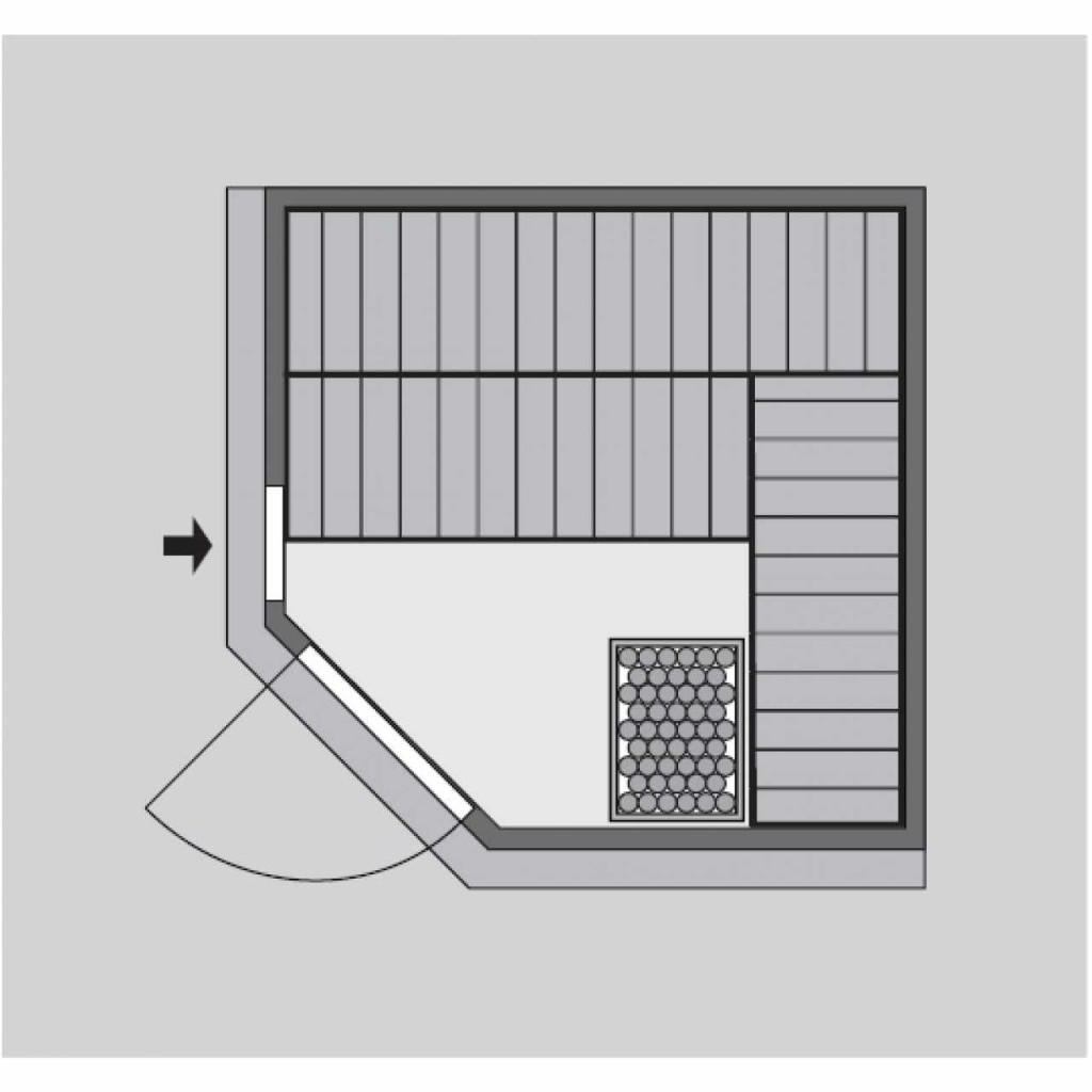 A szaunának nincs saját padlója, kizárólag megfelelő padlóburkolattal, ideális esetben járólappal ellátott helyiségben kell elhelyezni. A szaunát mennyezeti párkány (profil) nélküli kivitelben szállítjuk, 3 x 7,5 W LED világítással.