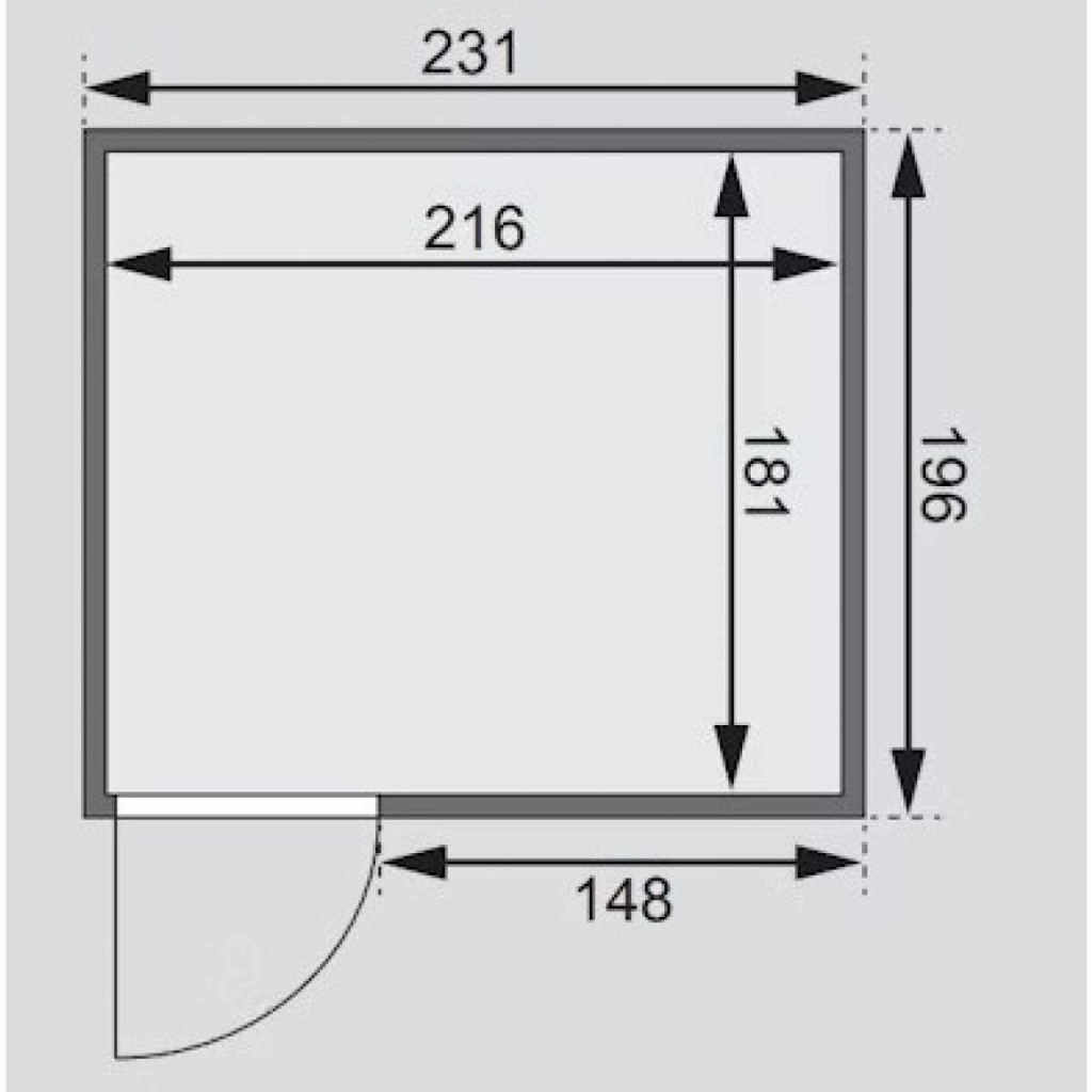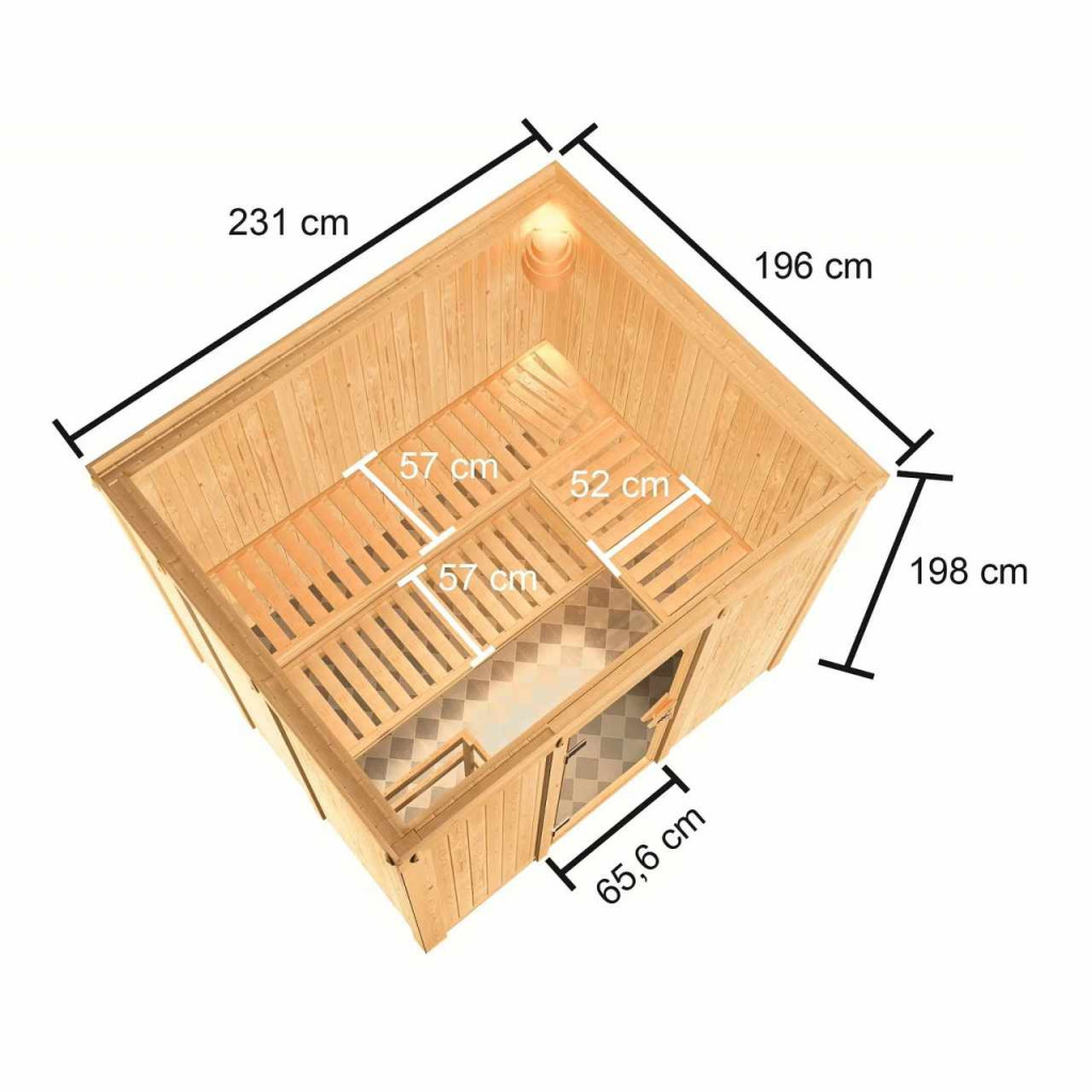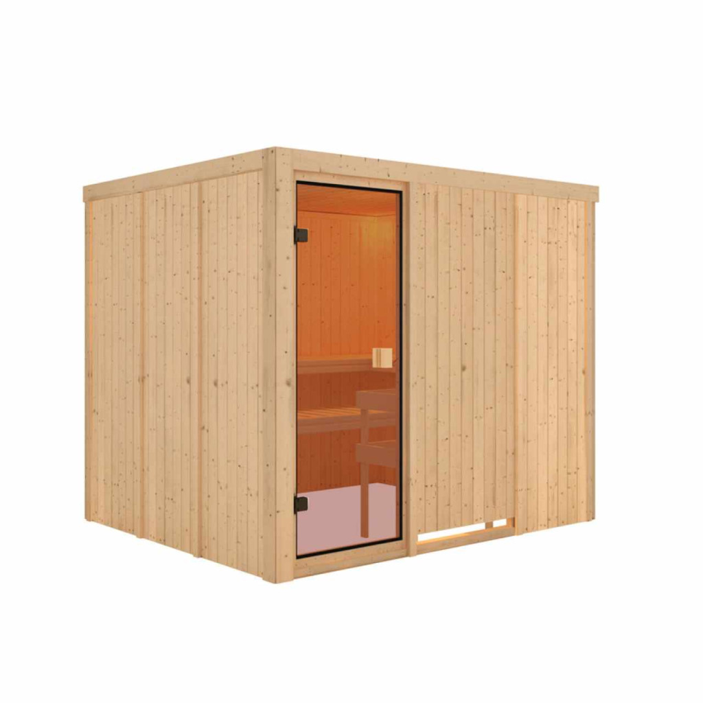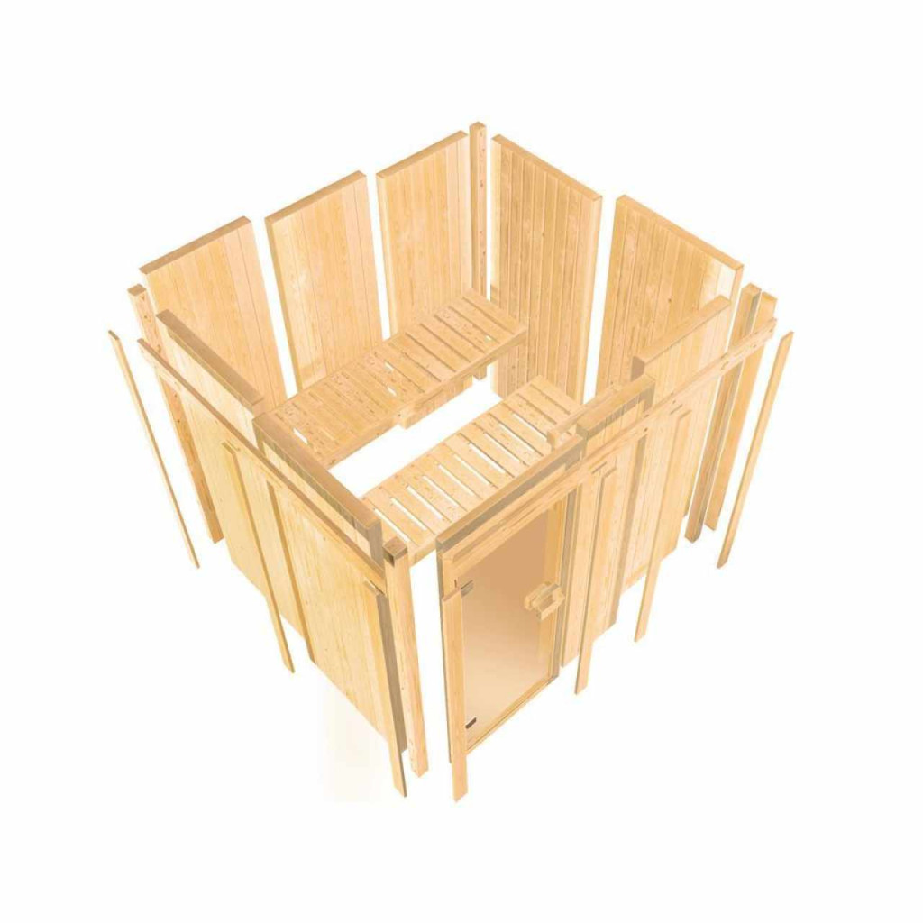 Finn szauna három fekvő személy számára kialakítva. Méretei: sz 231 x mé 196 x ma 198 cm. Ezt a finn szaunamodellt egy ház vagy lakás temperált belső teréhez tervezték. Gyártójának, a németországi Brémából származó KARIBU HOLZTECHNIK cégnek sikerült termékeivel sikeresen továbbvinnie a skandináv szaunakészítés évszázados hagyományait, miközben a mai modern technológiát is beépítette. A szauna teljes egészében skandináv lucfenyőfából készült, természetes kivitelben. A fa Európa északi részéből származik, és teljesen vegyszeresen kezeletlen (sem nem pácolt, sem nem lakkozott). Ennek eredményeképpen mentes minden olyan ismert problémás anyagtól, amely a szaunázás során a fából kioldódhatna. Ez a beltéri szauna kivételes hőszigetelő tulajdonságokkal rendelkezik. A szauna falai speciálisan simára simított, hornyolt deszkák belső és külső rétegéből állnak, amelyek között 42 mm vastag hőszigetelés található ásványgyapot formájában. A fal teljes vastagsága így 68 mm. A szauna hátsó, nem látható oldala farostlemezzel borított, amely a fal felé néz. Ezért azonos hőszigetelés mellett kb. 10 mm-rel vékonyabb, mint a deszkákkal borított nézeti oldalak.