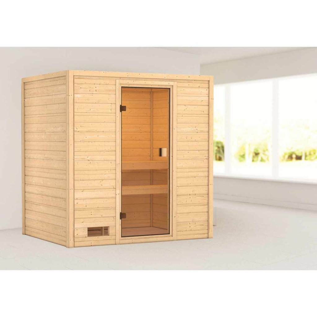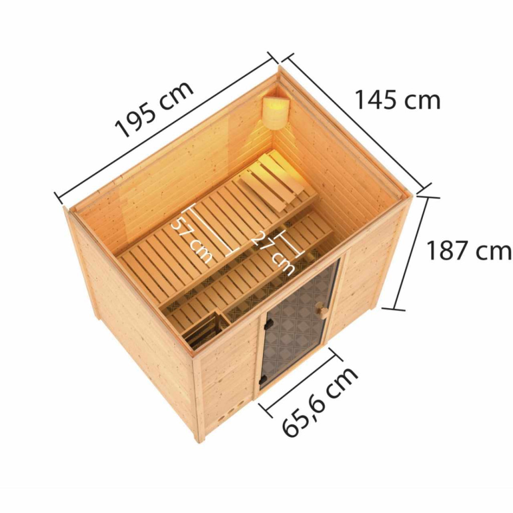 Finn szauna a kínálatunkban két személy számára. Téglalap alakú méretek sz 195 x mé 145 x ma 187 cm. Ezt a finn szaunamodellt ház vagy lakás temperált belső teréhez tervezték. Gyártójának, a németországi Brémából származó KARIBU HOLZTECHNIK cégnek sikerült termékeivel sikeresen továbbvinnie a skandináv szaunakészítés évszázados hagyományait, miközben a mai modern technológiát is beépítette. A szauna teljes egészében skandináv lucfenyőfából készült, természetes kivitelben. A fa Európa északi részéből származik, és teljesen vegyszeresen kezeletlen (sem nem pácolt, sem nem lakkozott). Ennek eredményeként mentes minden olyan ismert problémás anyagtól, amely a szaunázás során a fából kioldódhatna. Ez a beltéri szauna 38 mm vastag tömör fából készült. A szauna falai speciálisan simított, dupla nyelvvel és horonnyal ellátott deszkákból állnak, ami rendkívüli illesztési szilárdságot garantál