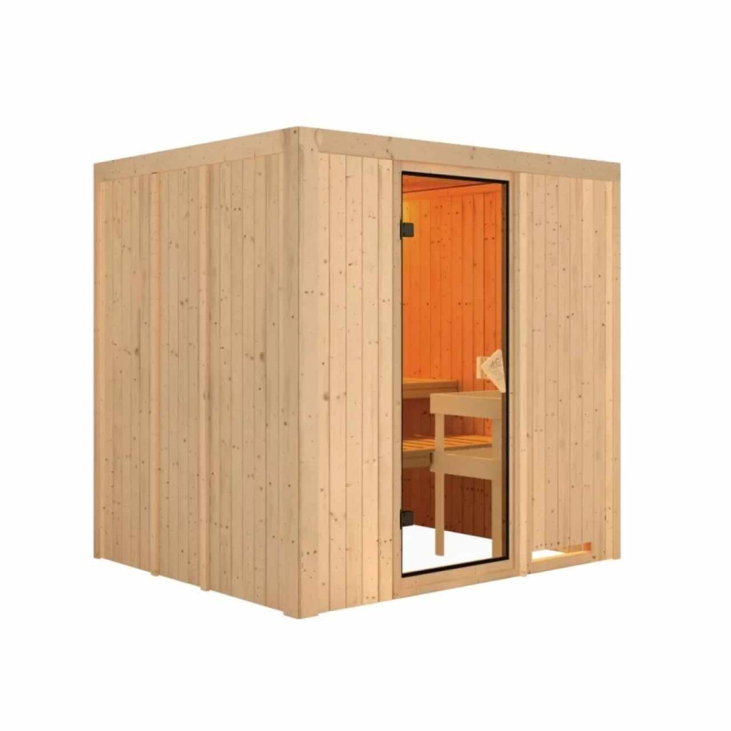 Ez a fajta finn szauna legfeljebb két fő részére lett tervezve. Ezt a finn szaunamodellt egy ház vagy lakás temperált belső teréhez tervezték. Méretek sz 196 x mé 170 x ma 198 cm. Gyártójának, a németországi Brémából származó KARIBU HOLZTECHNIK cégnek sikerült termékeivel sikeresen tovább vinnie a skandináv szaunák évszázados hagyományait, ugyanakkor a mai modern technológiákat is beépítette. A szauna teljes egészében északi lucfenyőből készült, természetes kivitelben. A fa Európa északi részéből származik, és teljesen vegyszeresen kezeletlen (sem nem festett, sem nem lakkozott). Ennek eredményeként mentes minden olyan ismert problémás anyagtól, amely a szaunázás során a fából felszabadulhat. Ez a beltéri szauna kivételes hőszigetelő tulajdonságokkal rendelkezik. A szauna falai speciálisan simított, hornyolt deszkák belső és külső rétegéből állnak, amelyek között 42 mm vastag hőszigetelés található ásványgyapot formájában. A fal teljes vastagsága így 68 mm. A hátsó, vagy a szoba fala felé néző, nem látható oldal keménylemez külsővel rendelkezik. Ezért azonos hőszigetelés mellett körülbelül 10 mm-rel vékonyabbak, mint a táblákkal borított nézeti oldalak.