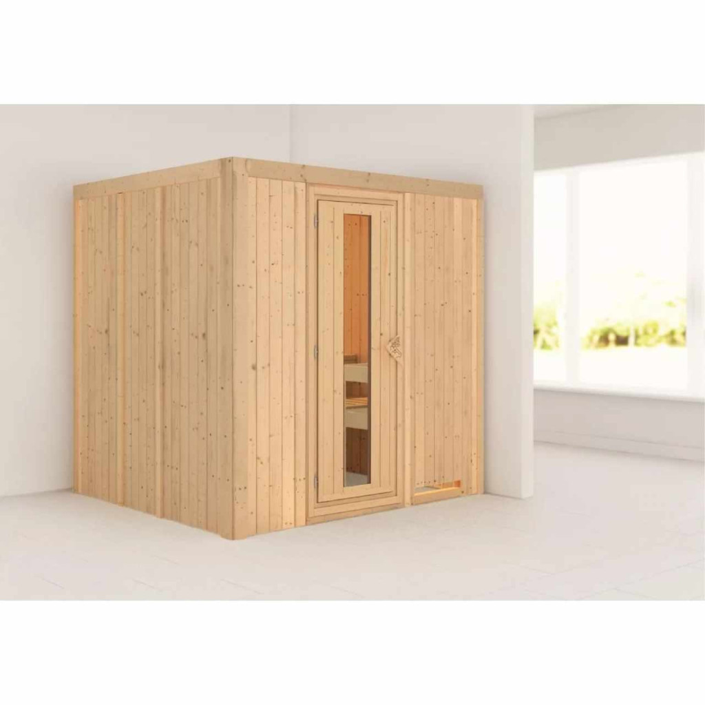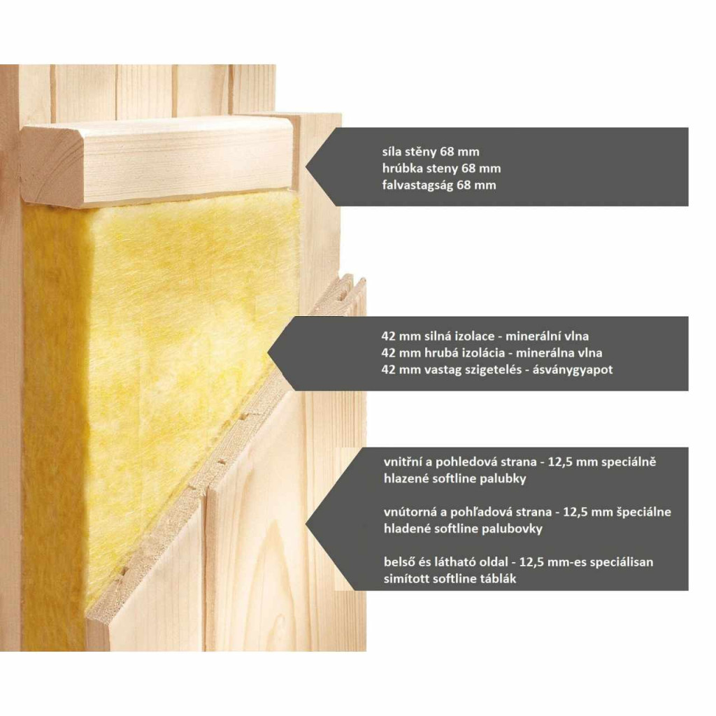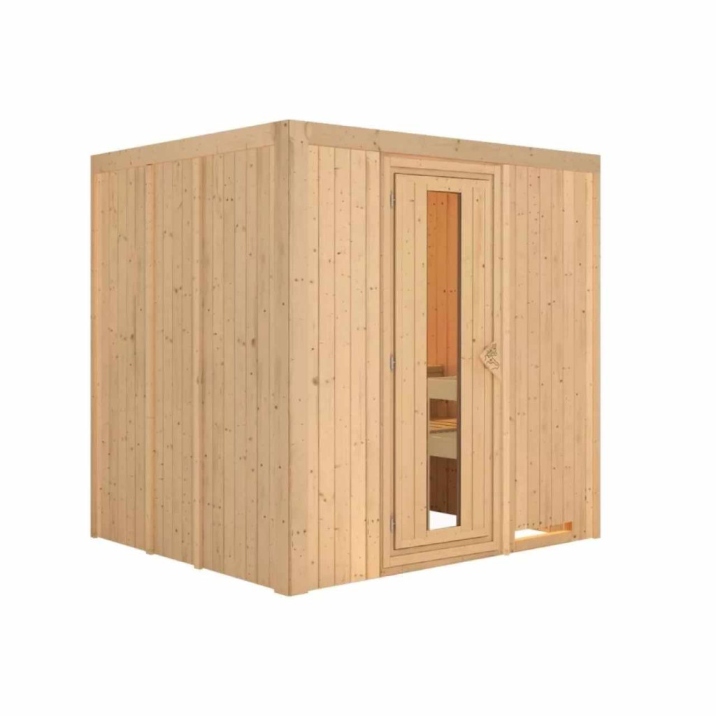 Ez a fajta finn szauna legfeljebb két fő részére lett tervezve. Ezt a finn szaunamodellt egy ház vagy lakás temperált belső teréhez tervezték. Méretek sz 196 x mé 170 x ma 198 cm. Gyártójának, a németországi Brémából származó KARIBU HOLZTECHNIK cégnek sikerült termékeivel sikeresen tovább vinnie a skandináv szaunák évszázados hagyományait, ugyanakkor a mai modern technológiákat is beépítette. A szauna teljes egészében északi lucfenyőből készült, természetes kivitelben. A fa Európa északi részéből származik, és teljesen vegyszeresen kezeletlen (sem nem festett, sem nem lakkozott). Ennek eredményeként mentes minden olyan ismert problémás anyagtól, amely a szaunázás során a fából felszabadulhat. Ez a beltéri szauna kivételes hőszigetelő tulajdonságokkal rendelkezik. A szauna falai speciálisan simított, hornyolt deszkák belső és külső rétegéből állnak, amelyek között 42 mm vastag hőszigetelés található ásványgyapot formájában. A fal teljes vastagsága így 68 mm. A hátsó, vagy a szoba fala felé néző, nem látható oldal keménylemez külsővel rendelkezik. Ezért azonos hőszigetelés mellett körülbelül 10 mm-rel vékonyabbak, mint a táblákkal borított nézeti oldalak.