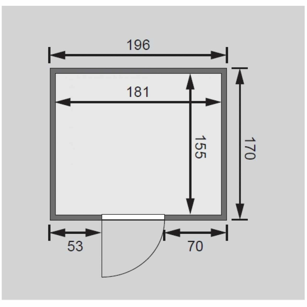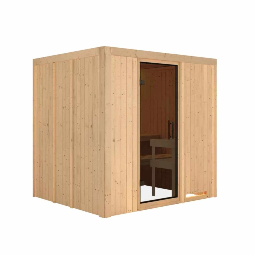 Ez a fajta finn szauna legfeljebb két fő részére lett tervezve. Ezt a finn szaunamodellt egy ház vagy lakás temperált belső teréhez tervezték. Méretek sz 196 x mé 170 x ma 198 cm. Gyártójának, a németországi Brémából származó KARIBU HOLZTECHNIK cégnek sikerült termékeivel sikeresen tovább vinnie a skandináv szaunák évszázados hagyományait, ugyanakkor a mai modern technológiákat is beépítette. A szauna teljes egészében északi lucfenyőből készült, természetes kivitelben. A fa Európa északi részéből származik, és teljesen vegyszeresen kezeletlen (sem nem festett, sem nem lakkozott). Ennek eredményeként mentes minden olyan ismert problémás anyagtól, amely a szaunázás során a fából felszabadulhat. Ez a beltéri szauna kivételes hőszigetelő tulajdonságokkal rendelkezik. A szauna falai speciálisan simított, hornyolt deszkák belső és külső rétegéből állnak, amelyek között 42 mm vastag hőszigetelés található ásványgyapot formájában. A fal teljes vastagsága így 68 mm. A hátsó, vagy a szoba fala felé néző, nem látható oldal keménylemez külsővel rendelkezik. Ezért azonos hőszigetelés mellett körülbelül 10 mm-rel vékonyabbak, mint a táblákkal borított nézeti oldalak.